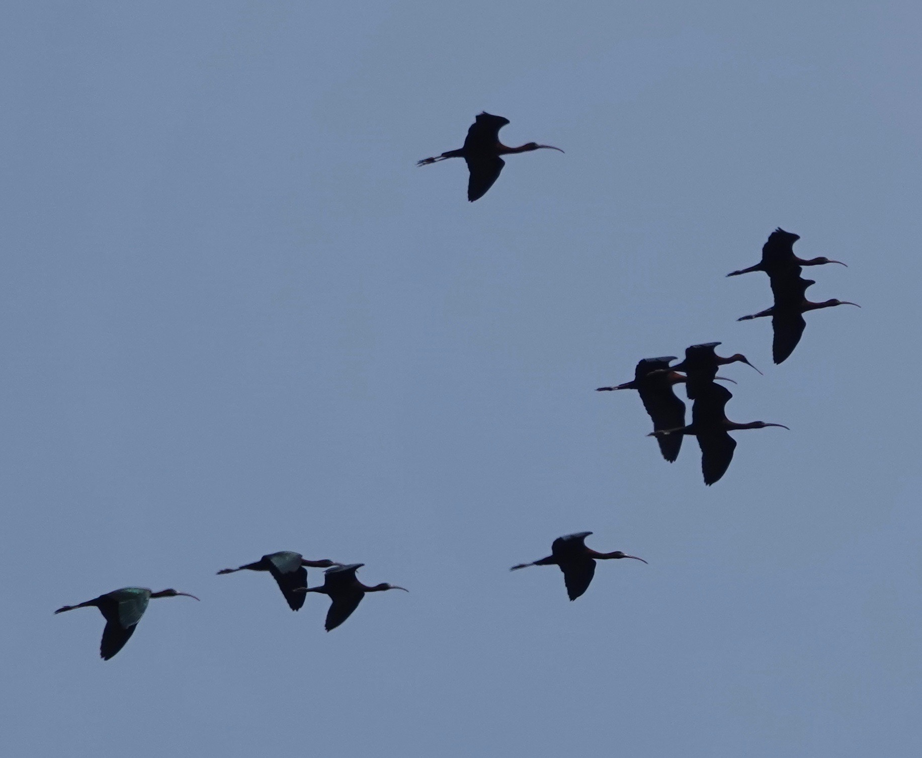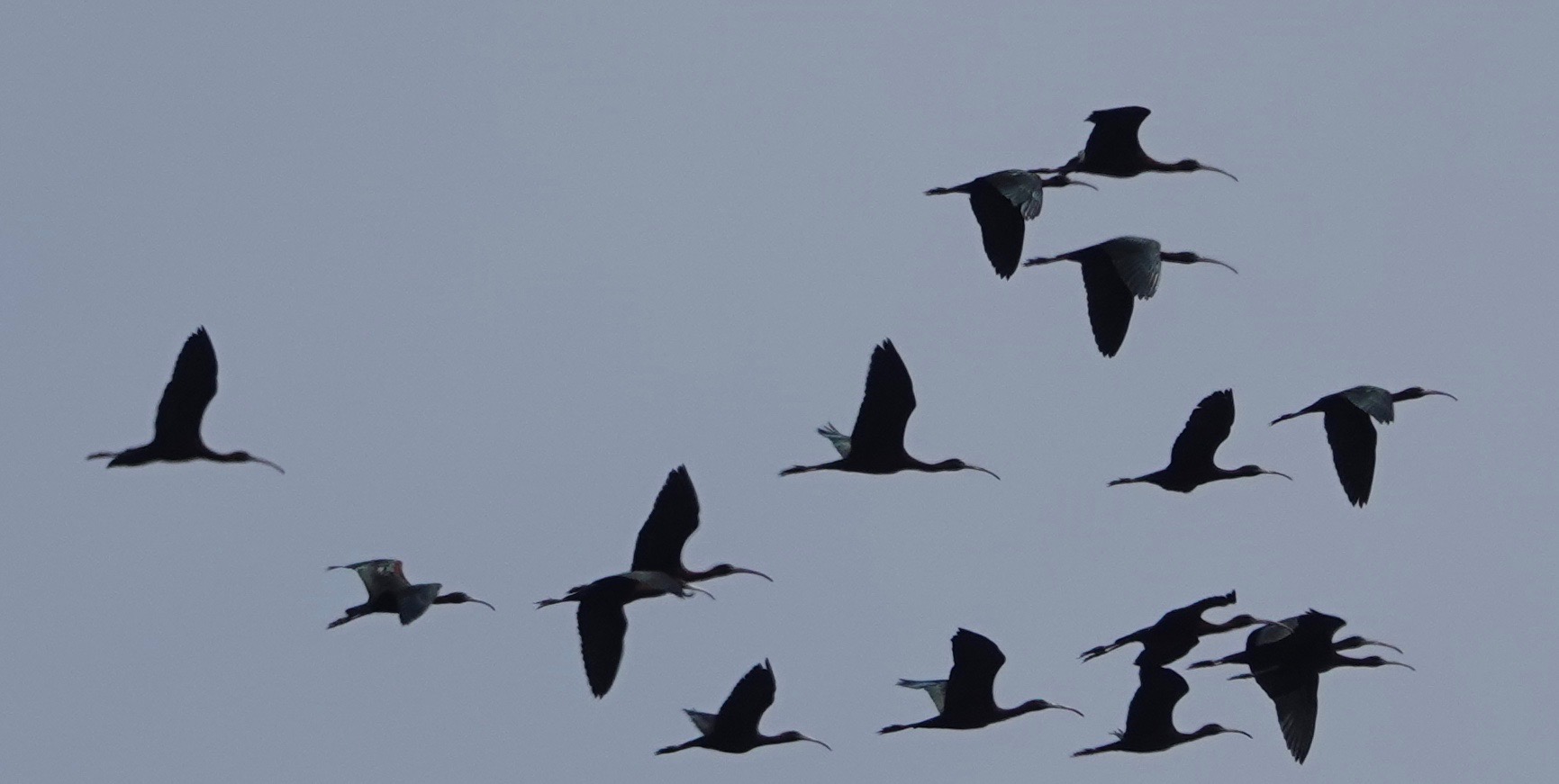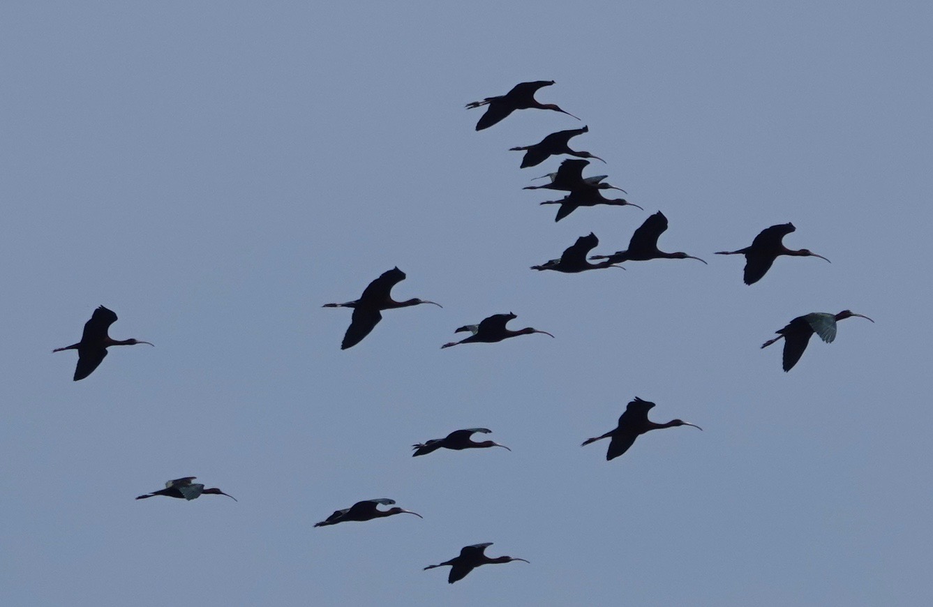 Sixteen sacred, or profane, Glossy Ibises flying overhead at Marine Park Saltmarsh Nature Center.
