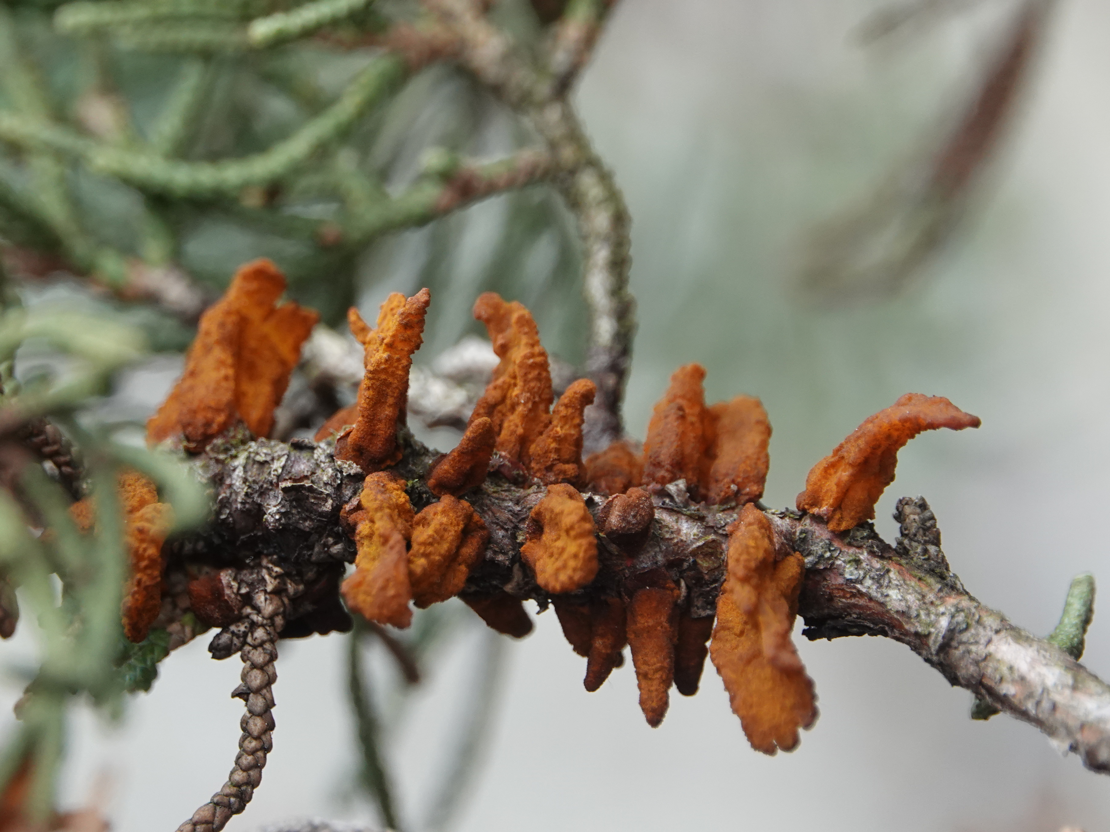 On another species of Juniperus, these Tongues of Flame/G. clavariiforme don’t create a gall but just bust right out of the twigs. Several days previously, these would have looked more jelly-like. They’re the spore launchers. This is another rust that jumps back and forth between junipers and hawthorns.