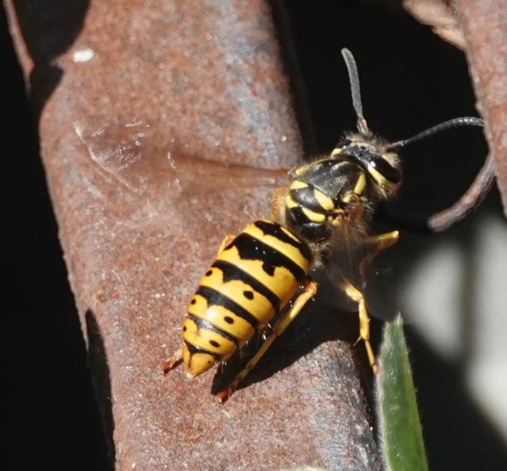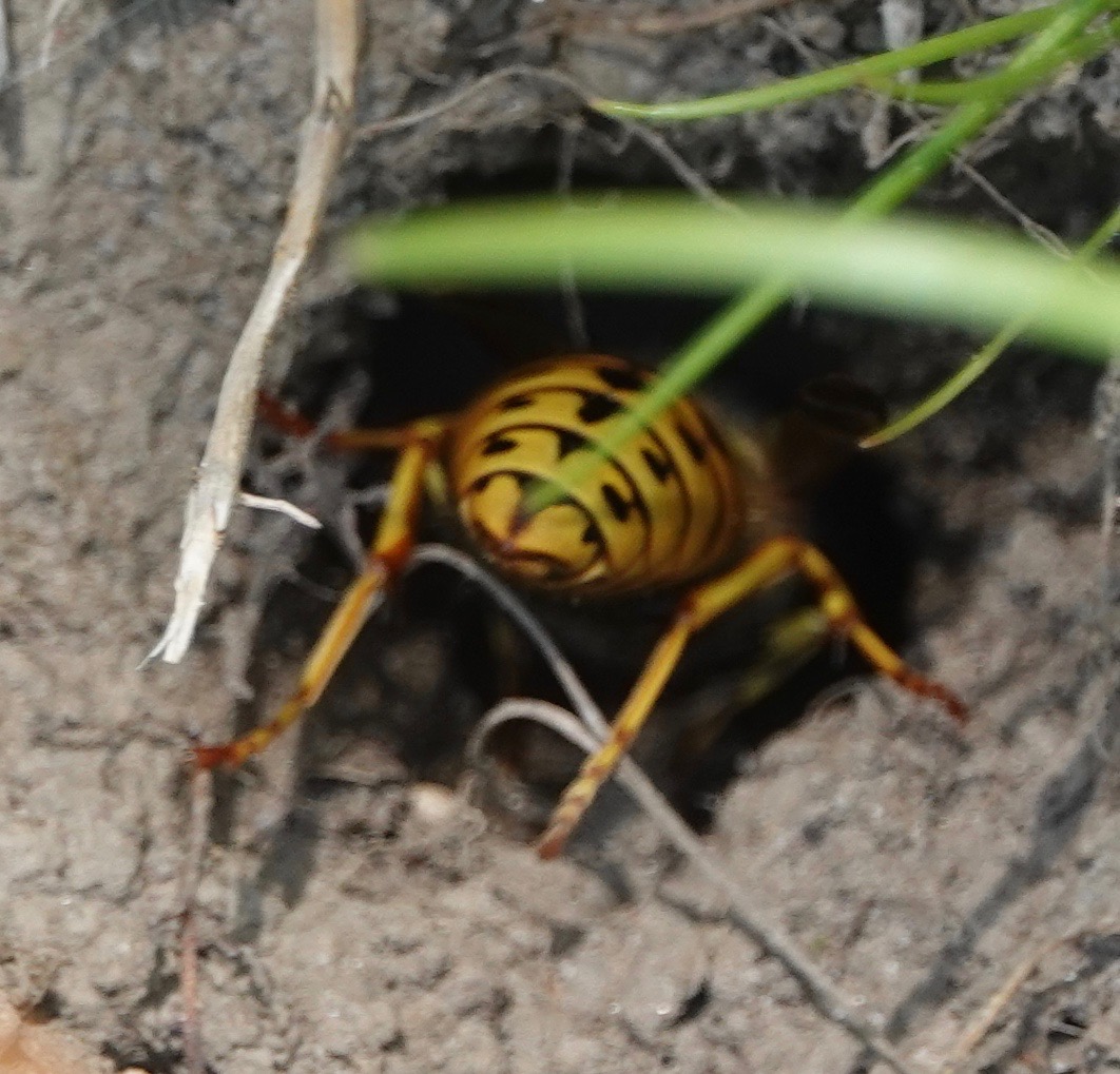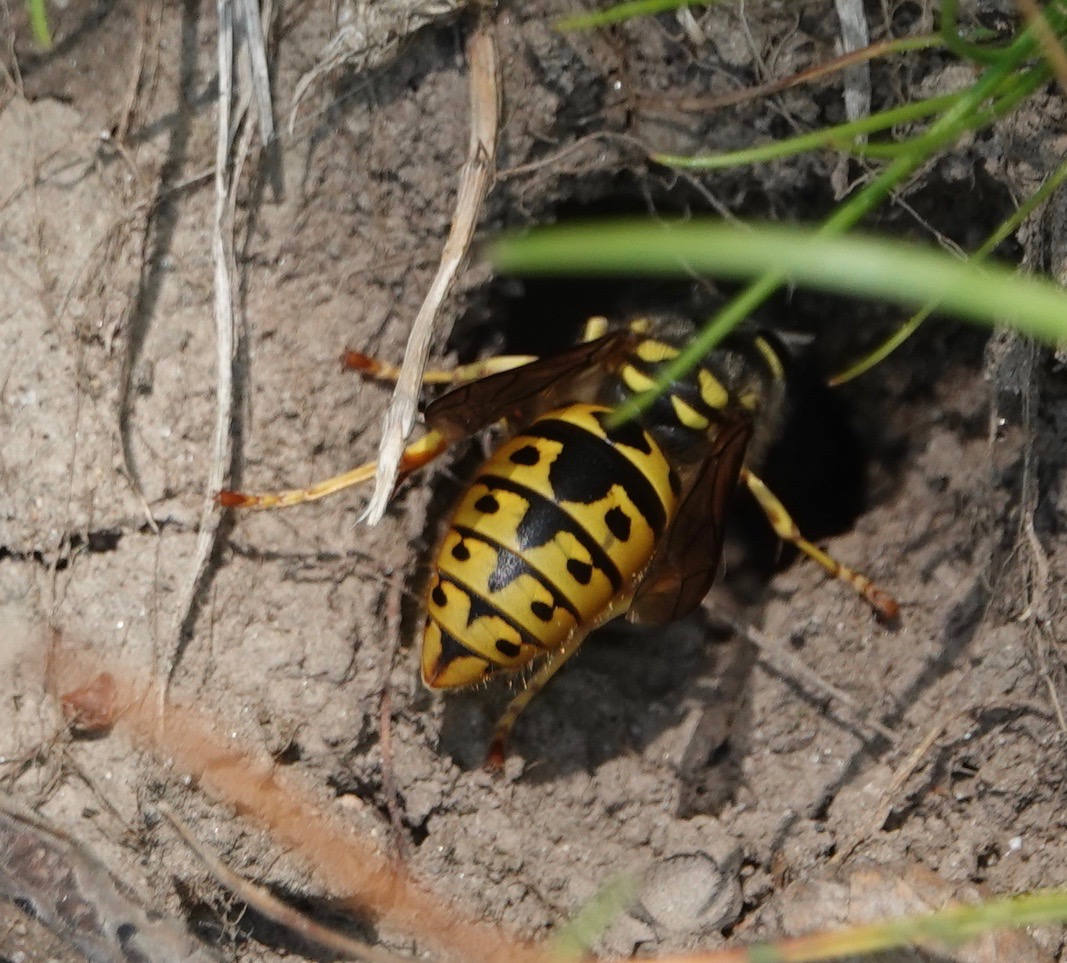 Now for some ground yellowjackets. Vespula maculifons above. The gynes, females who mated last year, are now searching for places to start their nests. As “ground yellowjackets” suggests, they often go underground.