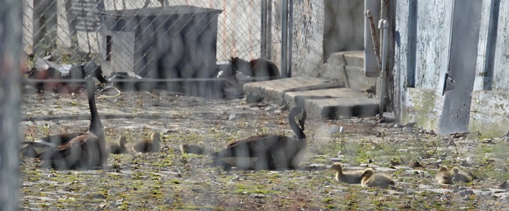 The fencing here surrounds one side of an empty warehouse building. Canada Geese are on both sides of the fencing. Sharp eyes will see at least three of the feral cats in the mix at well.