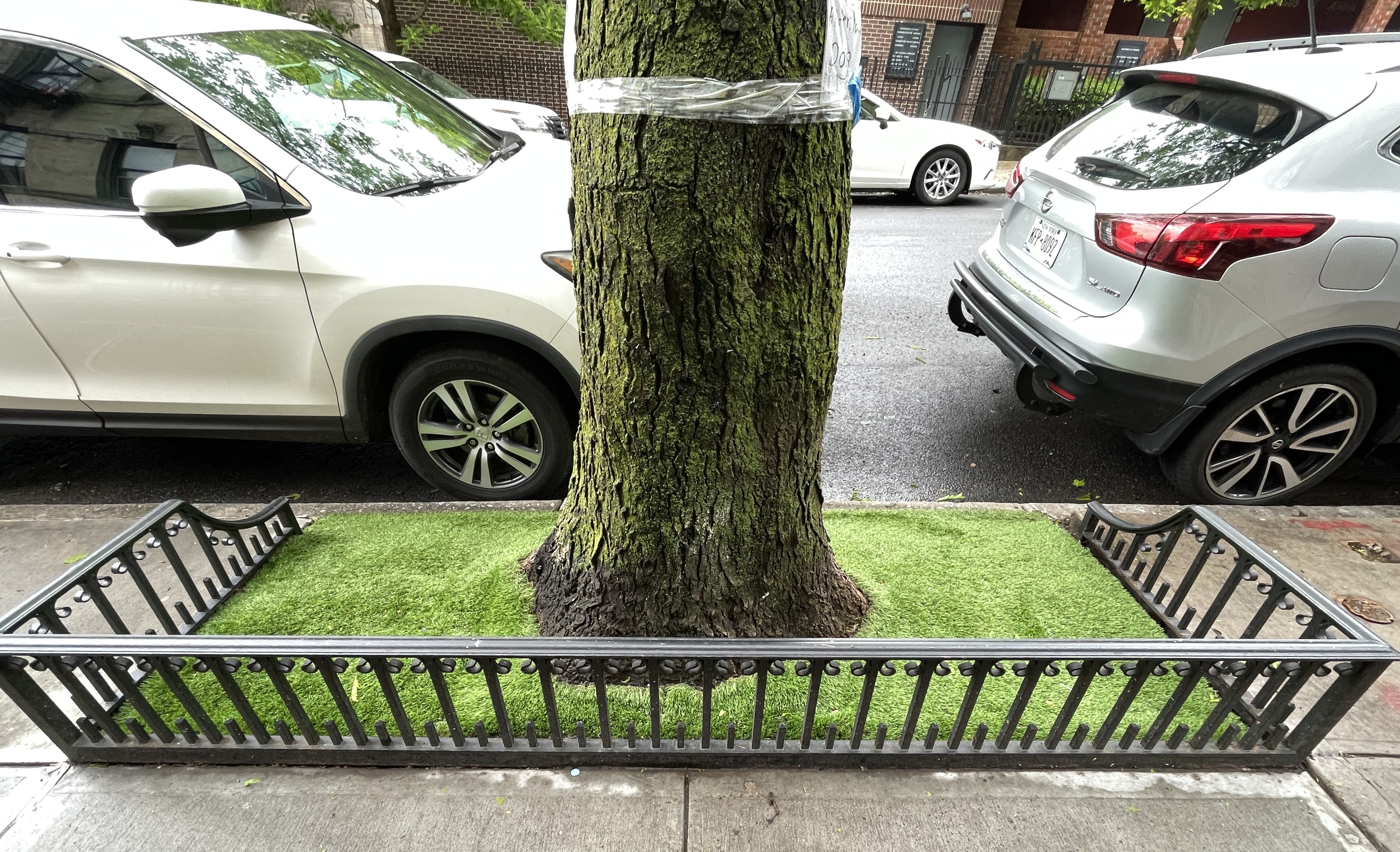 I’ve seen a lot of abused tree pits in this town: bricked up, rubbled up, garbaged up, shitted up. Turned into parking for two-wheeled-vehicles of various sorts, with long chains around the tree. I’ve seen ’em treeless and I’ve seen ’em completely filled up with a rectangle of horizontal tree growth, like roots come to the surface.