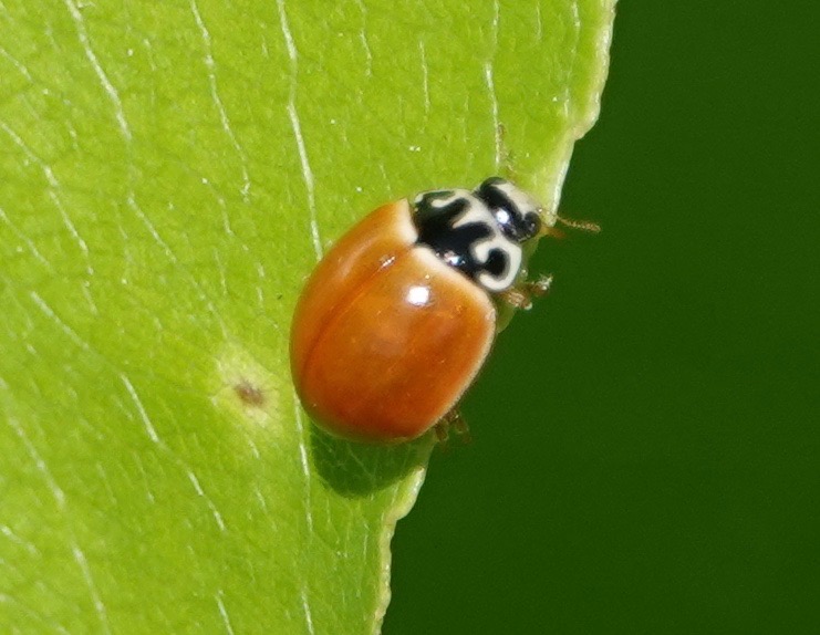 Native lady beetles are uncommon locally. This is one of them: Polished Lady Beetle/Cycloneda munda. They can be mistaken for spotless forms of the Asian Lady Beetle/Harmonia ayridis, but the pronotum pattern here is quite distinct.