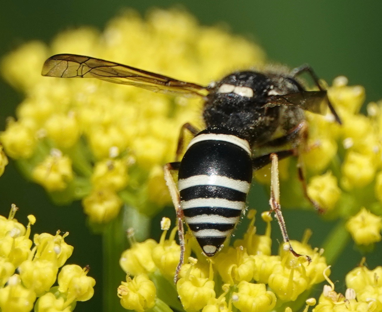 I saw four species of potter wasps, my first of the year, all gathering food from the Golden Alexanders/Zizia. One of them was this Walden’s Potter Wasp/Ancistrocerus waldenii. This seems to be the first iNat sighting of this species in NYC.