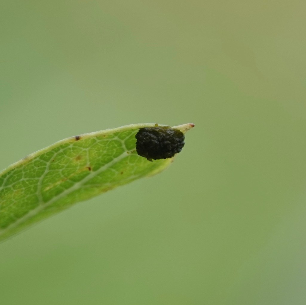 I also noticed a number of these things under the leaves of the dogbane. At first I wondered if they were Exema genus warty leaf beetles, which look like little clumps of poo. (Most of these dogbane plants were behind a fence and I couldn’t get up close and personal.) But no, they are little clumps of poo: these are, I learned, Dogbane Leaf Beetle eggs cleverly disguised with frass, i.e., beetle excrement.