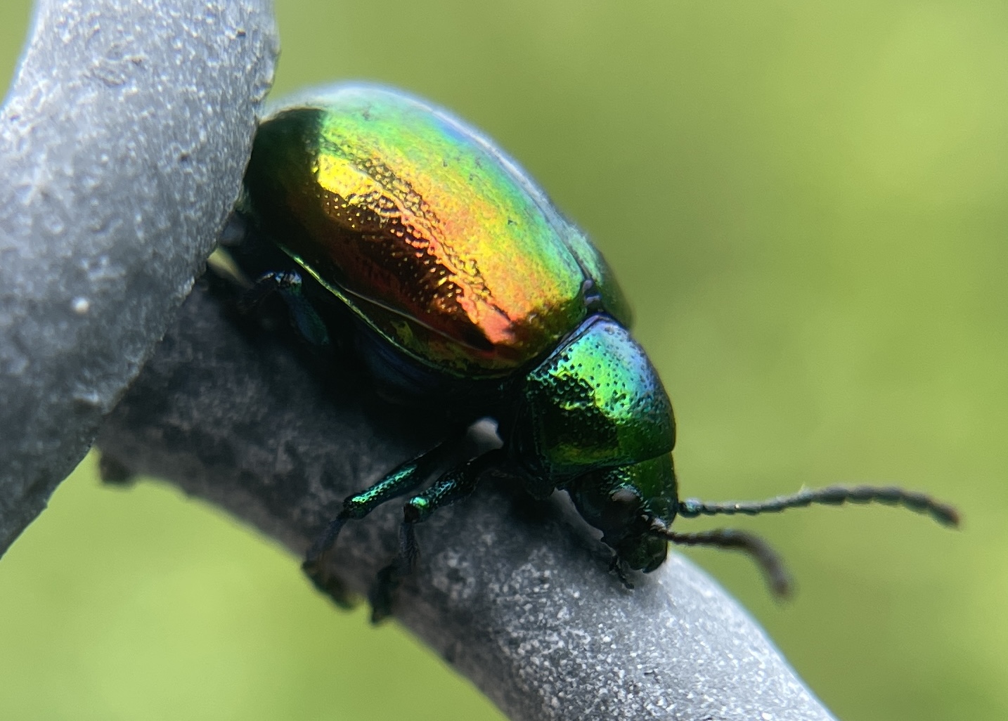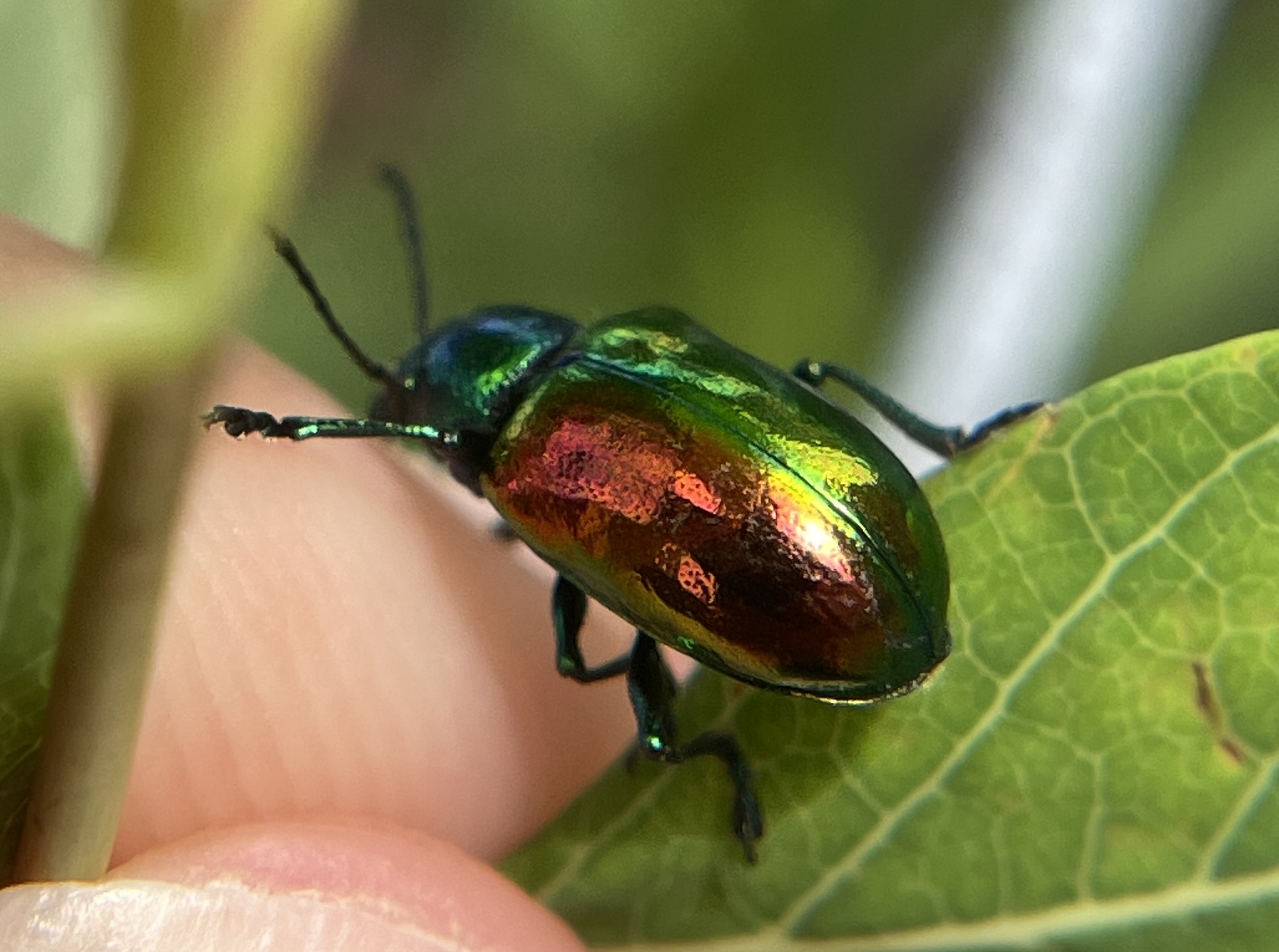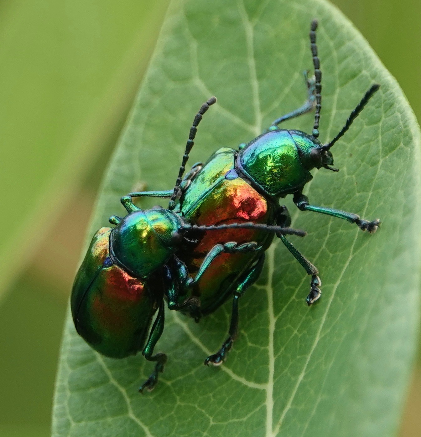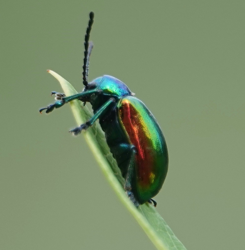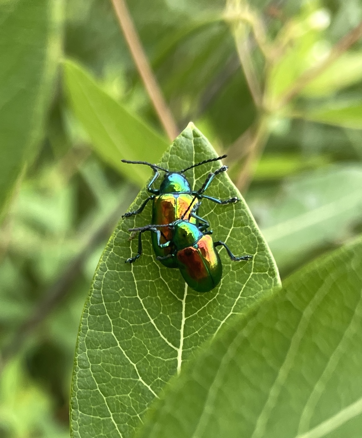 I have been on the lookout for Dogbane Leaf Beetles/Chrysochus auratus. They can potentially be found anywhere Hemp Dogbane/Apocynum cannabinum is found, for they eat the stuff. They’re known in NYC, including my subdivision thereof (Brooklyn). But it was only this past weekend that I finally came across several, including at least three mating pairs.
