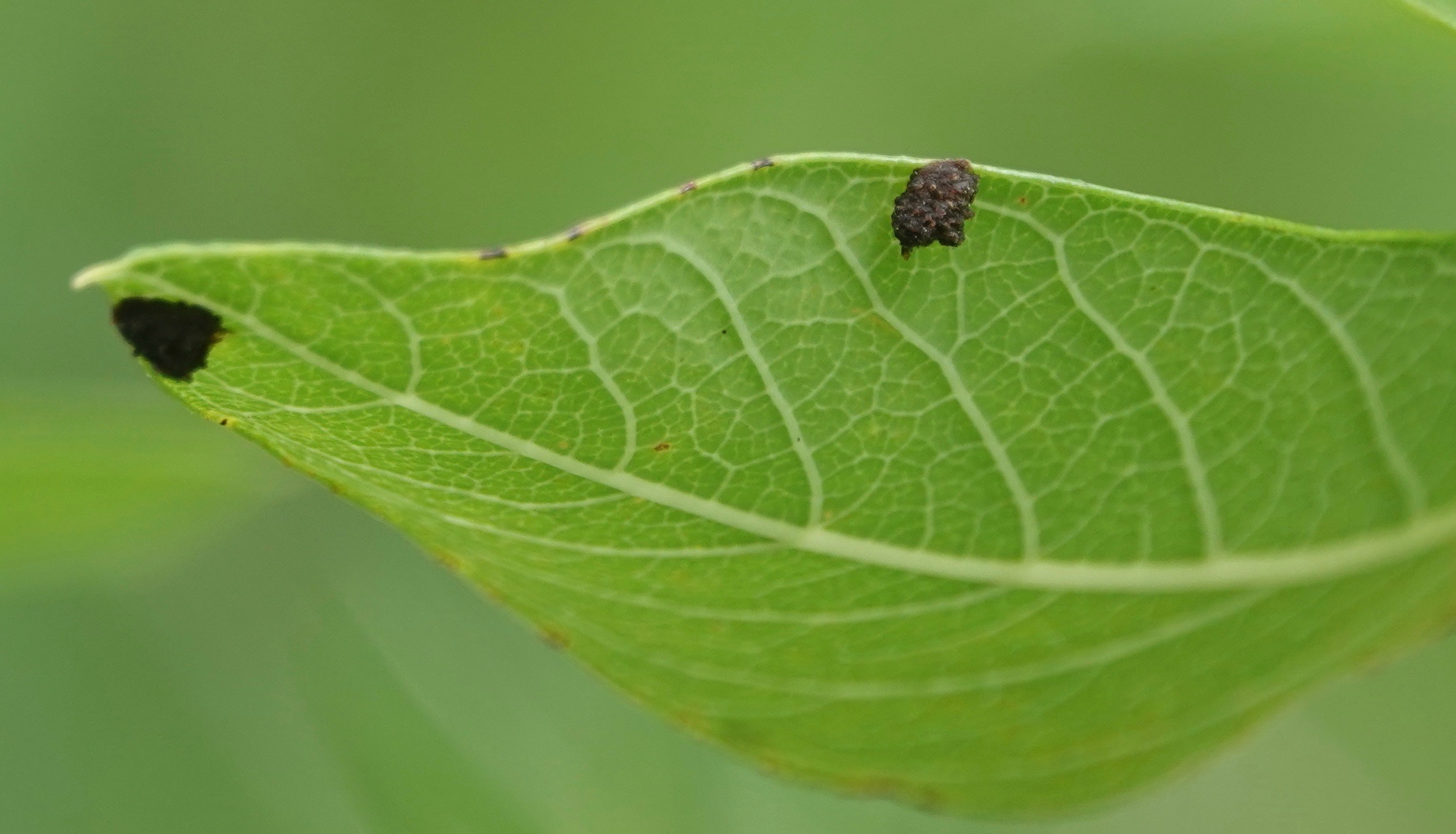 I also noticed a number of these things under the leaves of the dogbane. At first I wondered if they were Exema genus warty leaf beetles, which look like little clumps of poo. (Most of these dogbane plants were behind a fence and I couldn’t get up close and personal.) But no, they are little clumps of poo: these are, I learned, Dogbane Leaf Beetle eggs cleverly disguised with frass, i.e., beetle excrement.