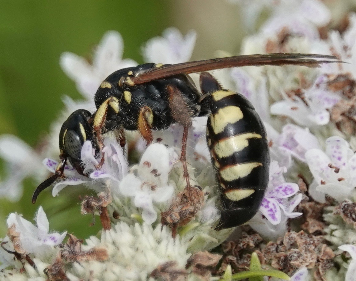 Here’s another. The most frequently seen wasp on these flowers at Bush Terminal. There’s a good bit of sandy soil around, which is what these nest in.