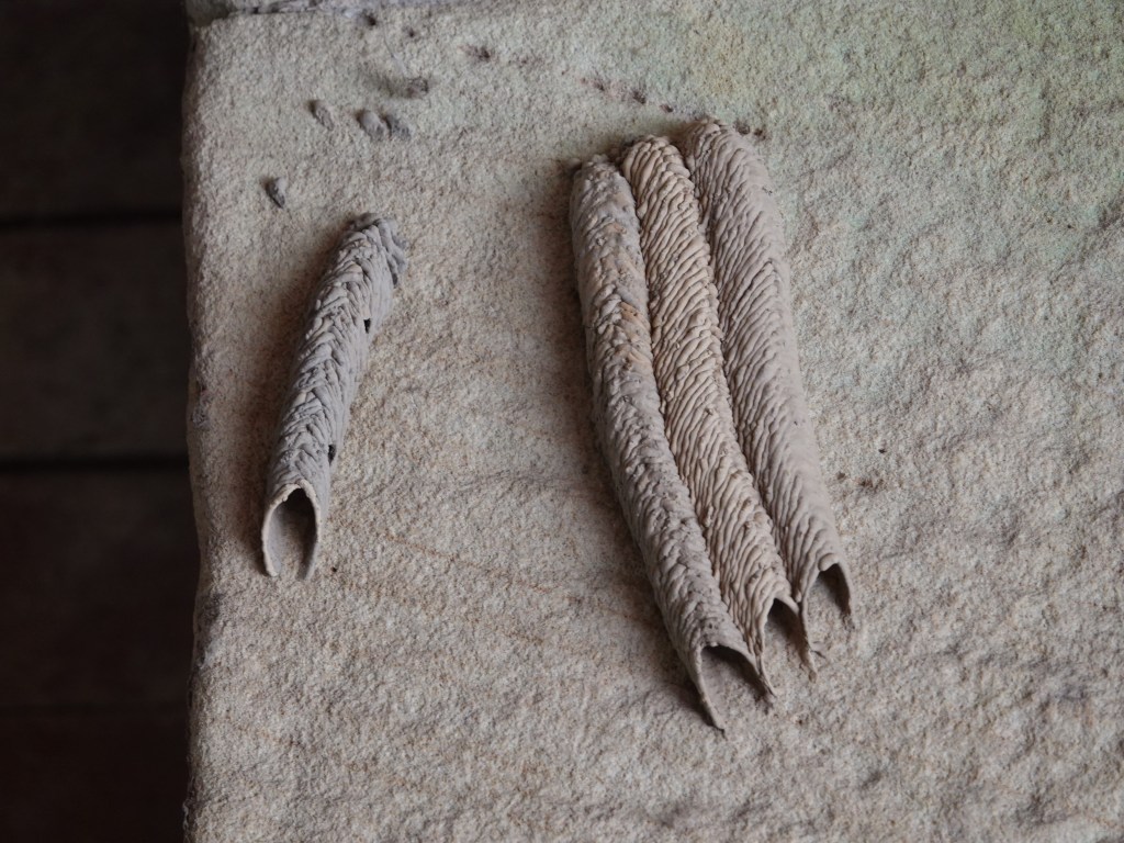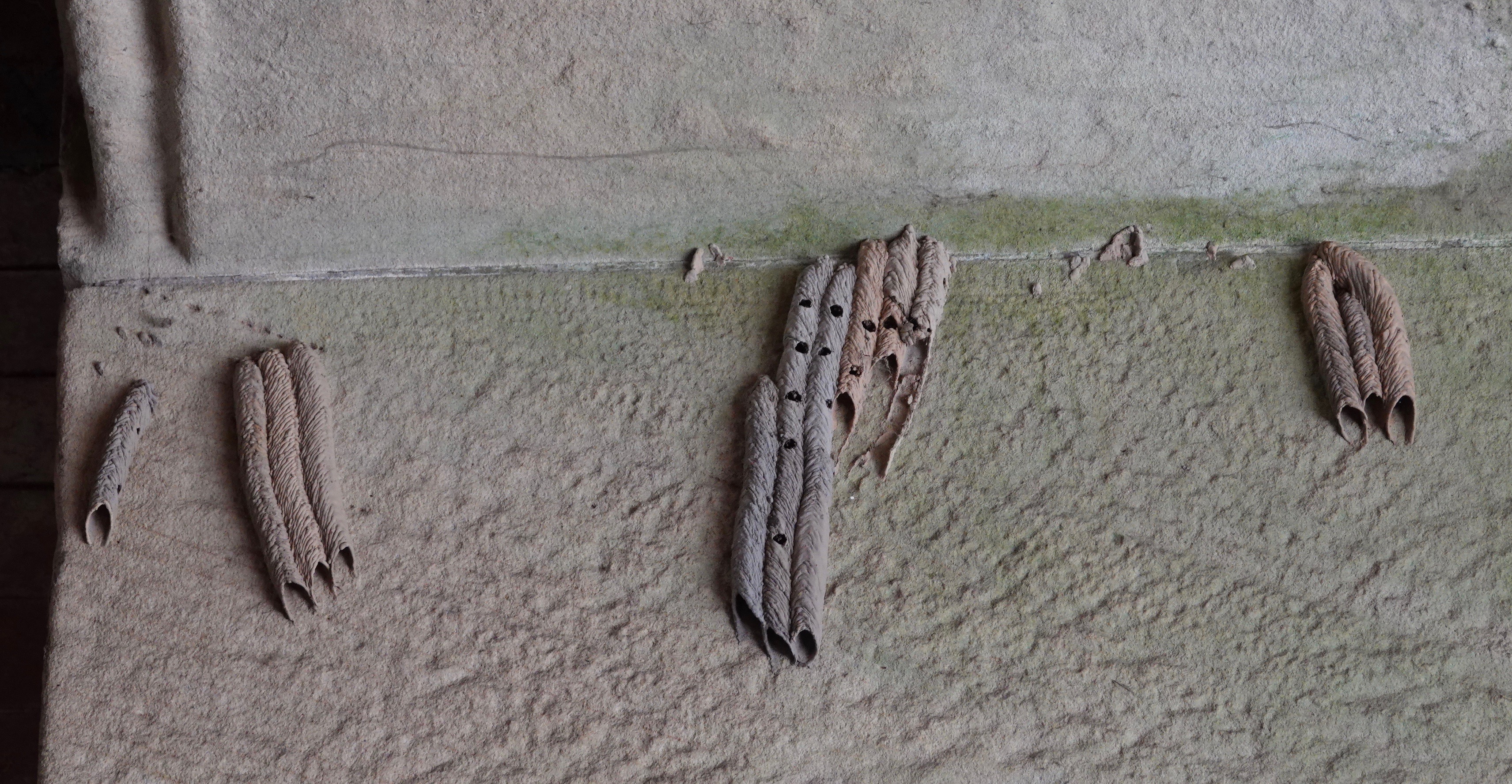 The very distinctive organ-pipe like mud tubes built by Trypoxylon politum, the Orang-pipe Mud-dauber Wasp. The ones with holes are previous years.