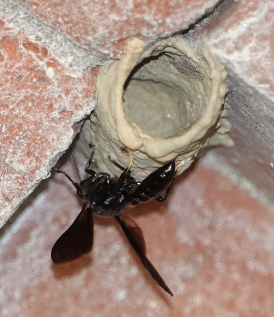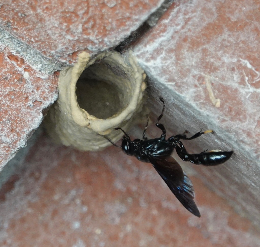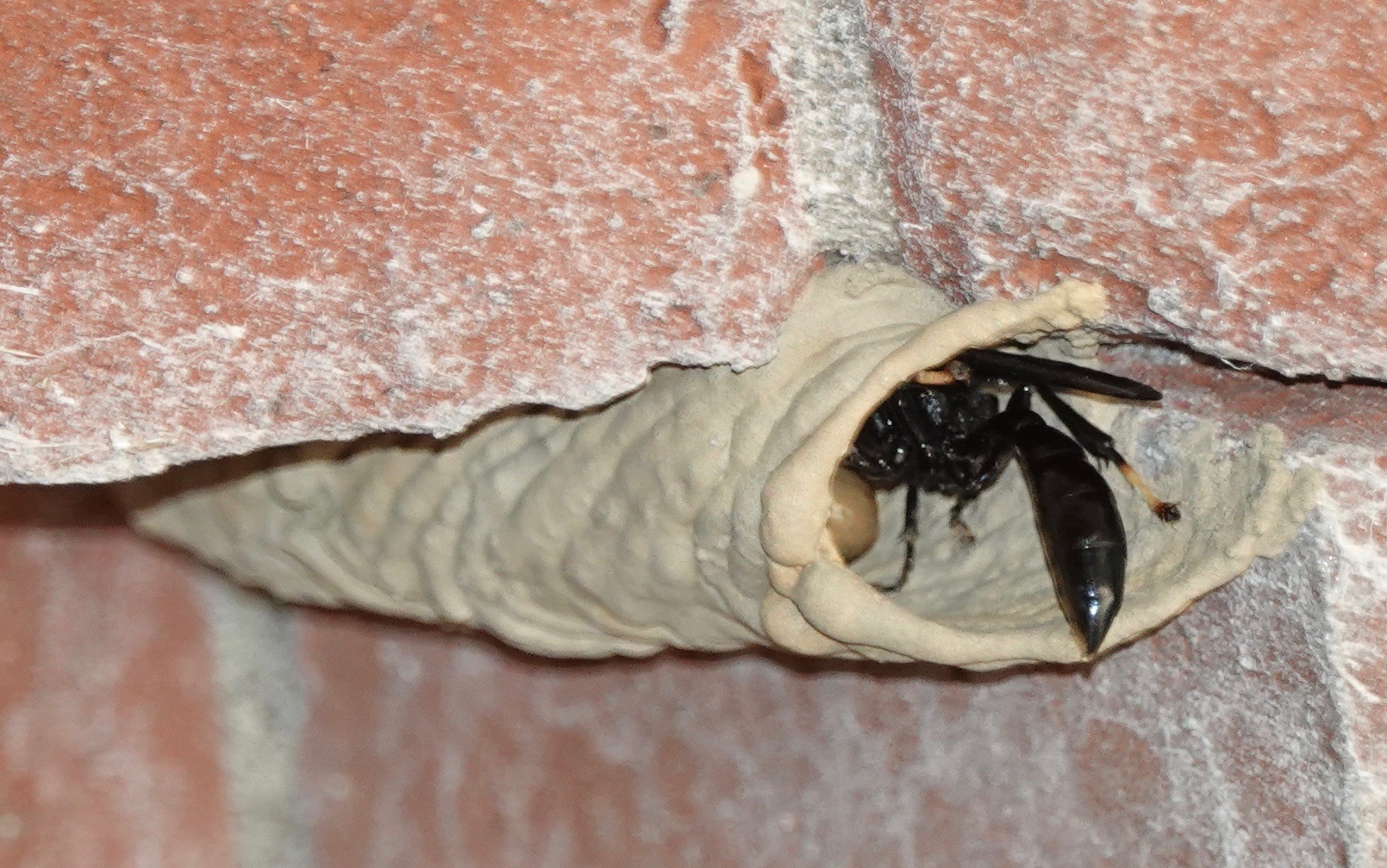 The females construct these tubes with small balls of mud. Since she’s inside here, I suspect that she’s constructing an internal wall, to separate the chambers she stuffs with paralyzed spiders and one of her eggs.
