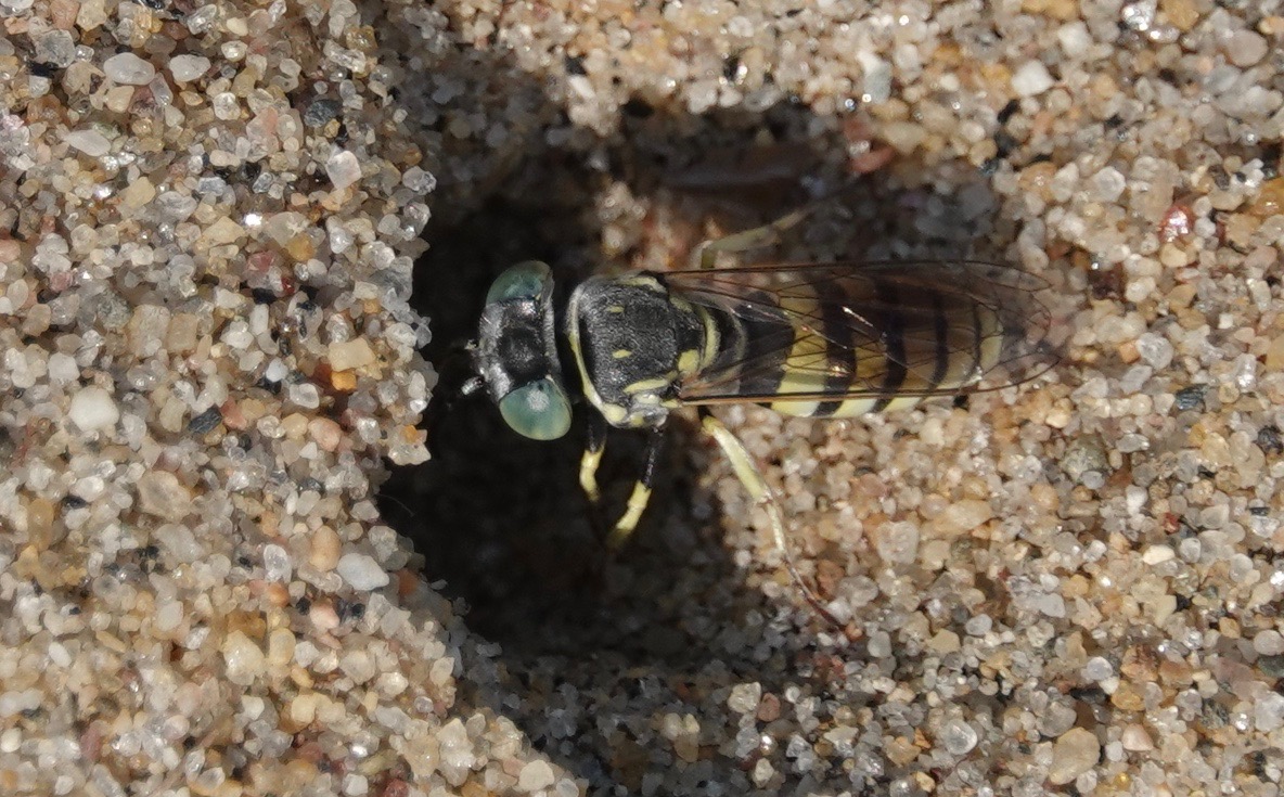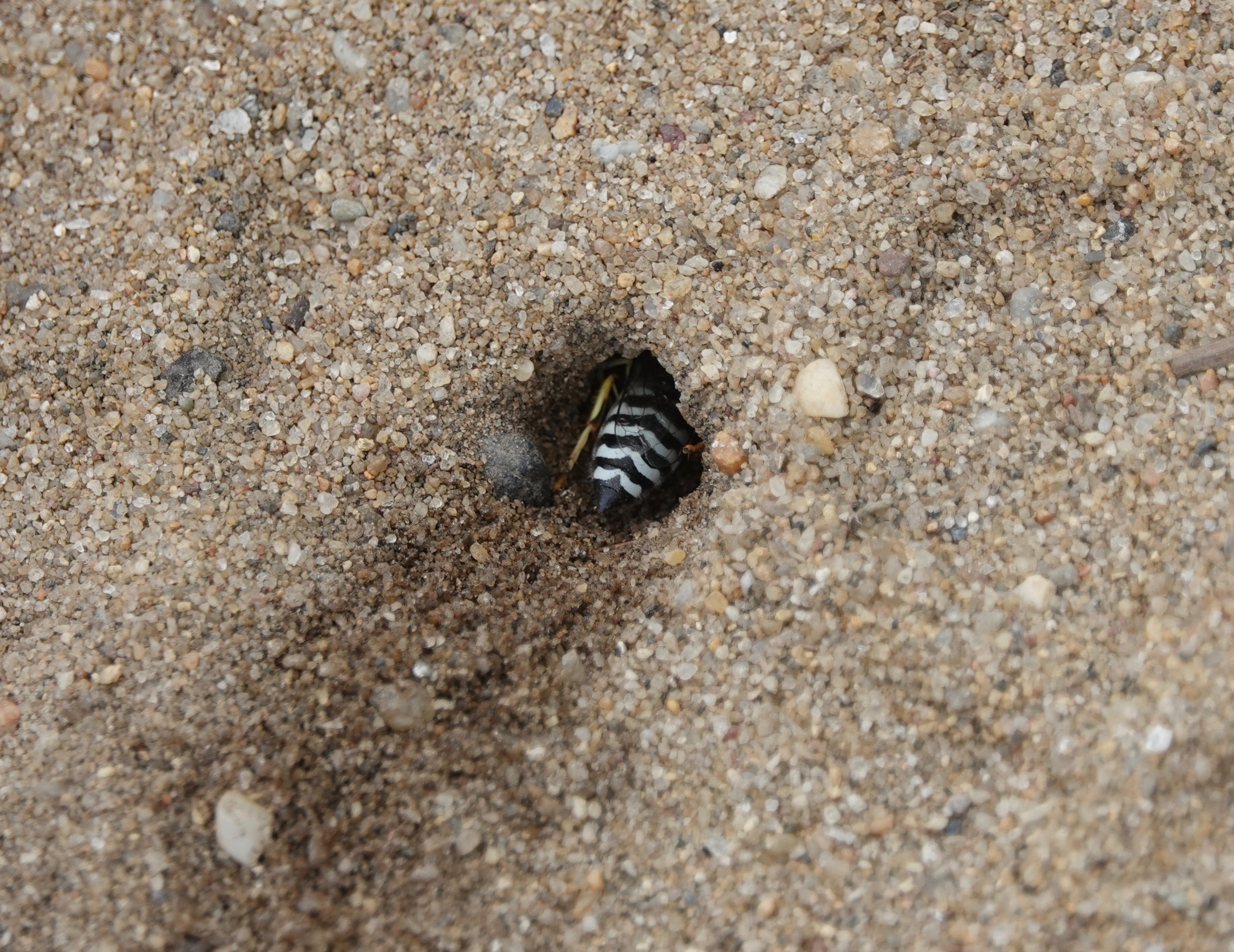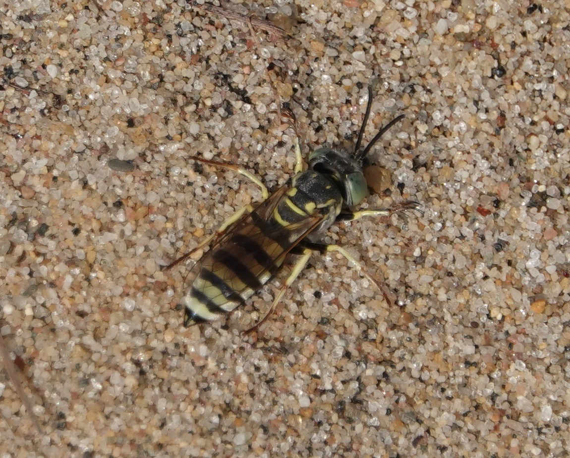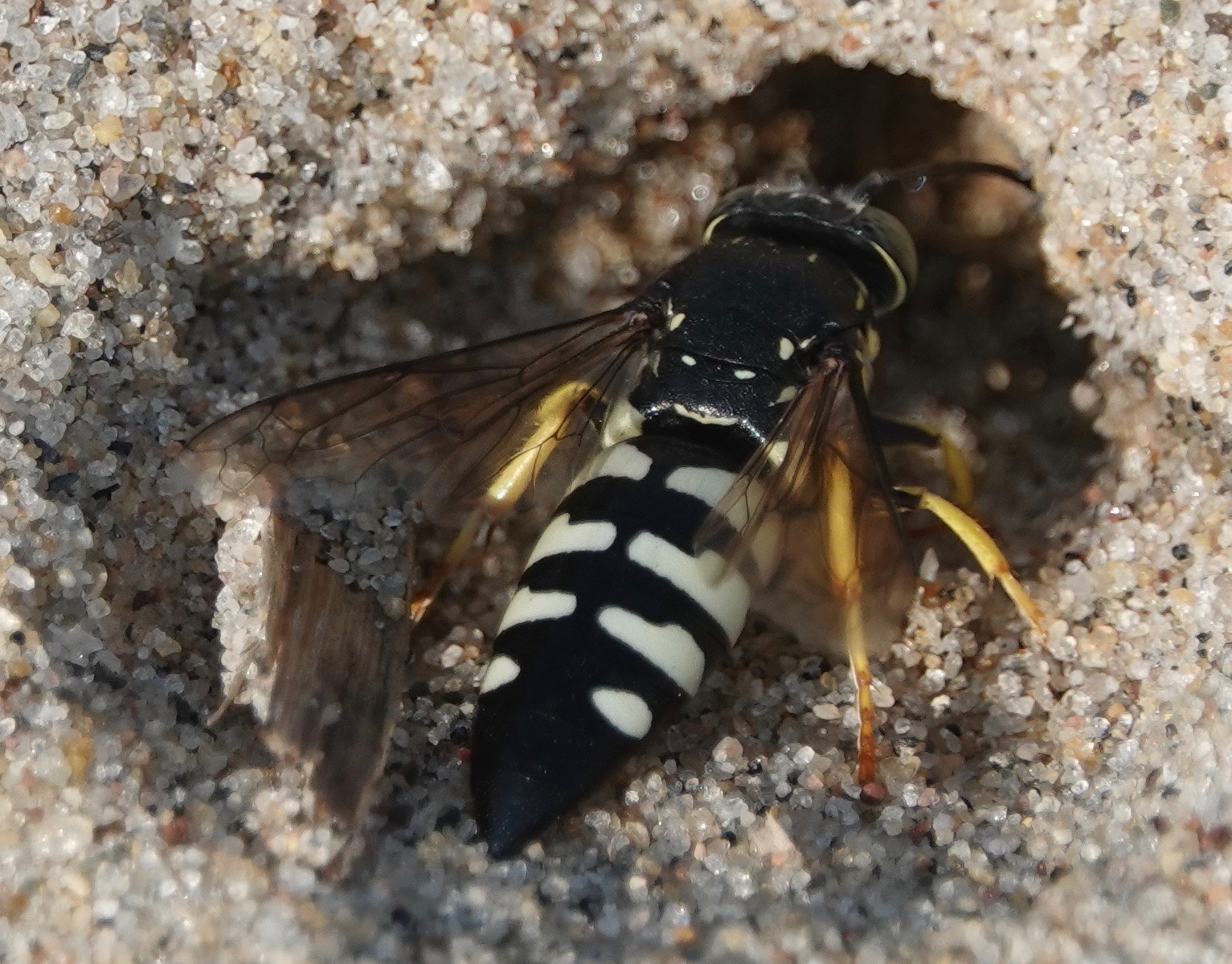 Microbembex monodonta. A little smaller than the Bembix. This species is a scavenger, which is a little unusual (locally), since most of our wasps like paralyzed prey for their young. Remarkable how these sand grains hold up to tunnelling.