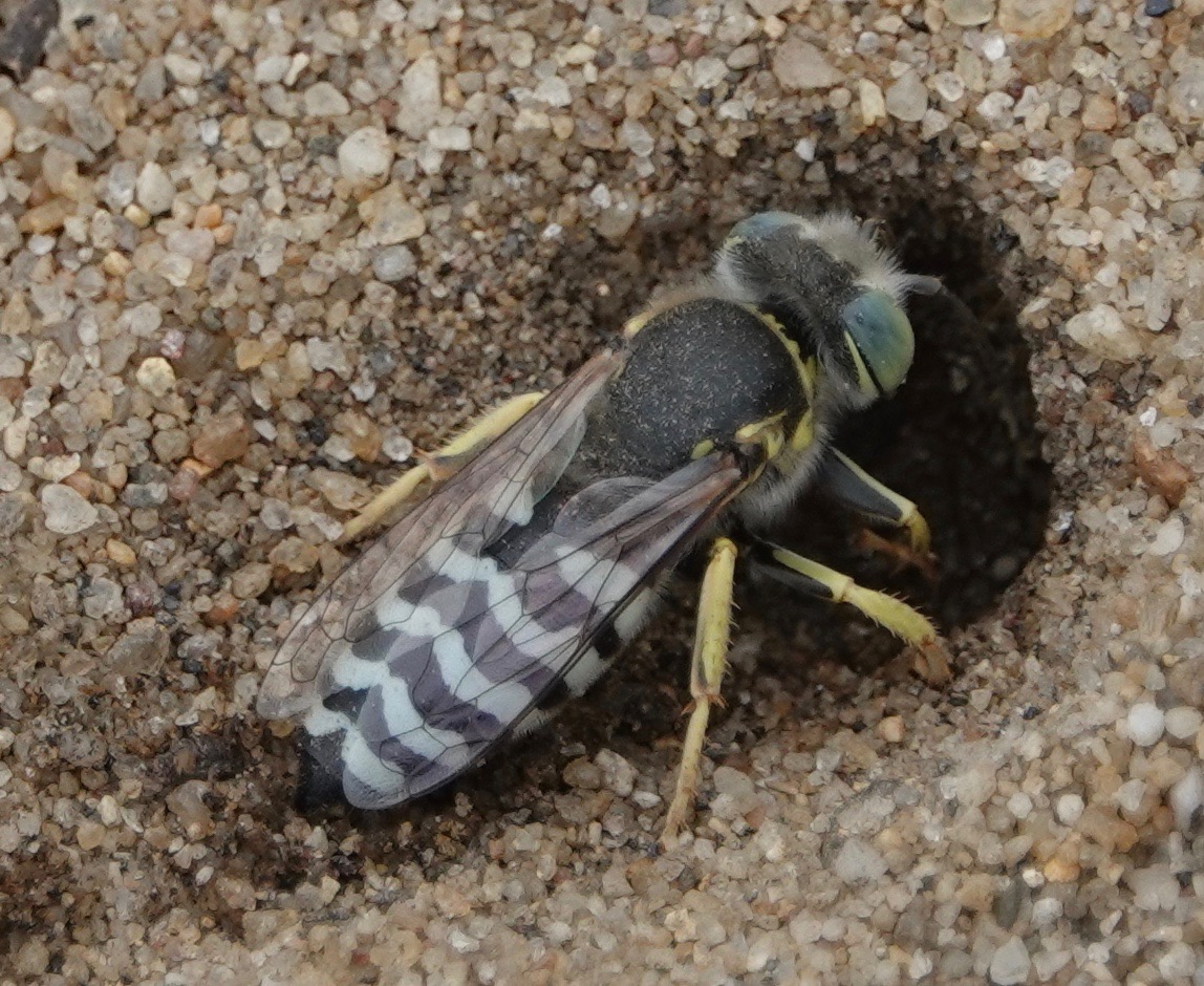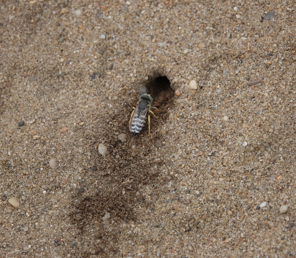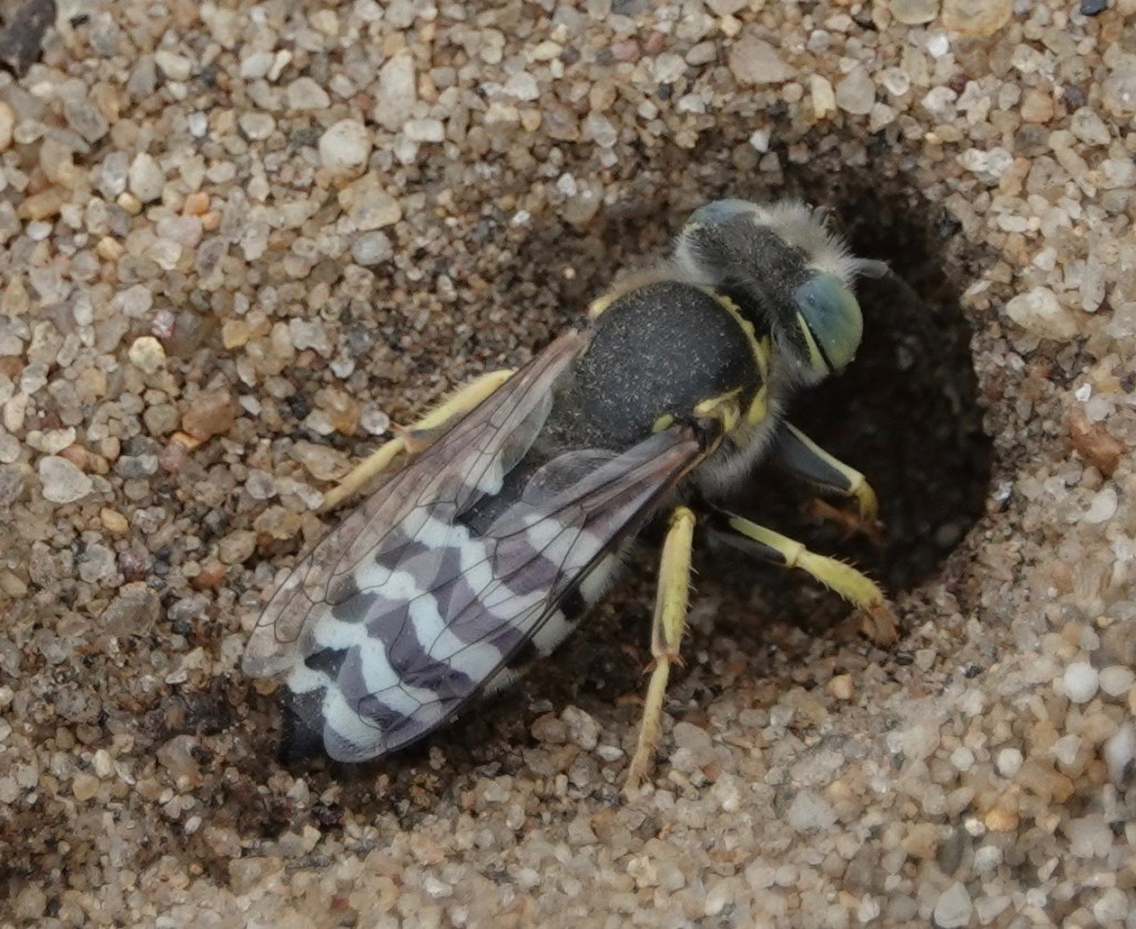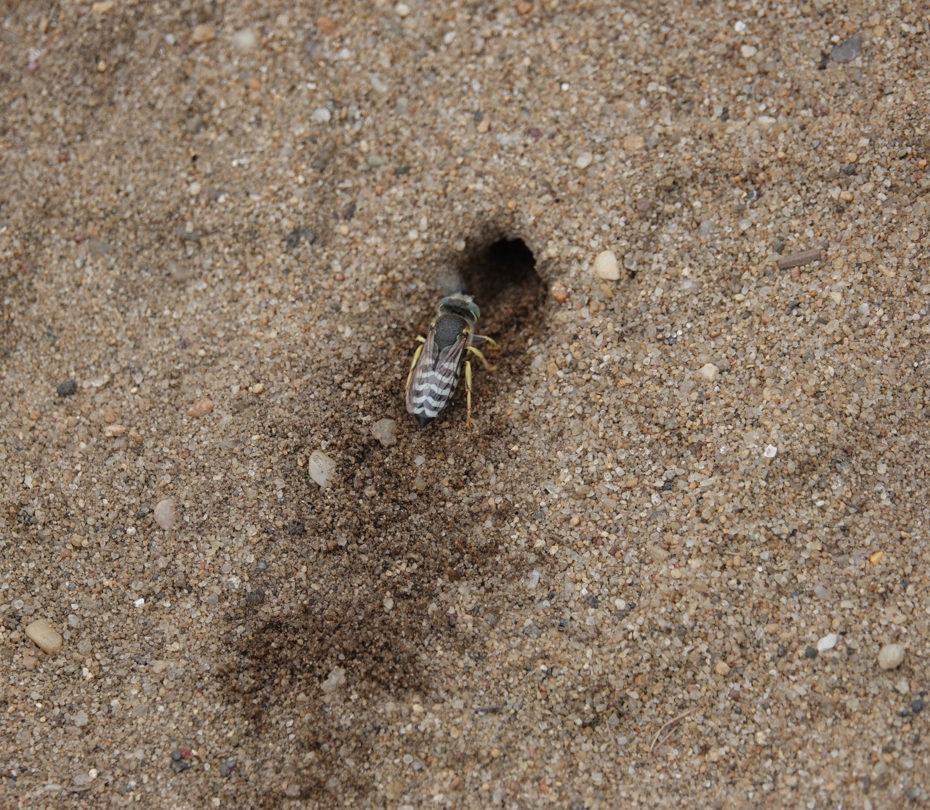 Microbembex monodonta. A little smaller than the Bembix. This species is a scavenger, which is a little unusual (locally), since most of our wasps like paralyzed prey for their young. Remarkable how these sand grains hold up to tunnelling.