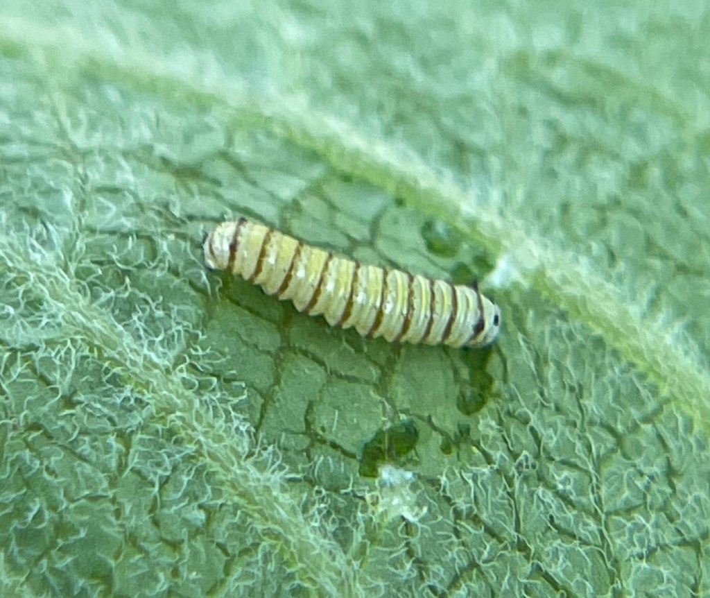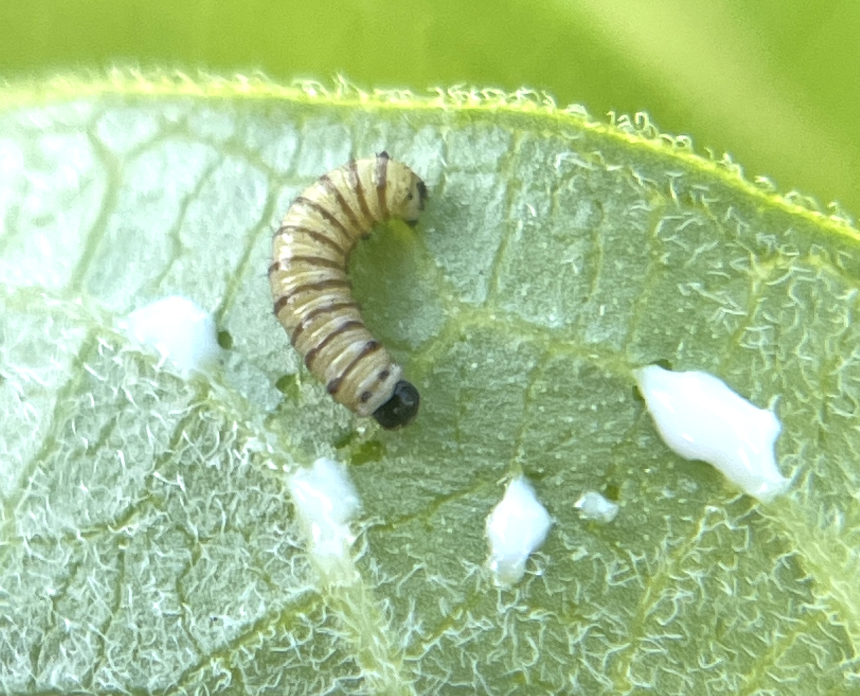 A trio of Monarch caterpillars, all about 5mm long so far, eating Common Milkweed.