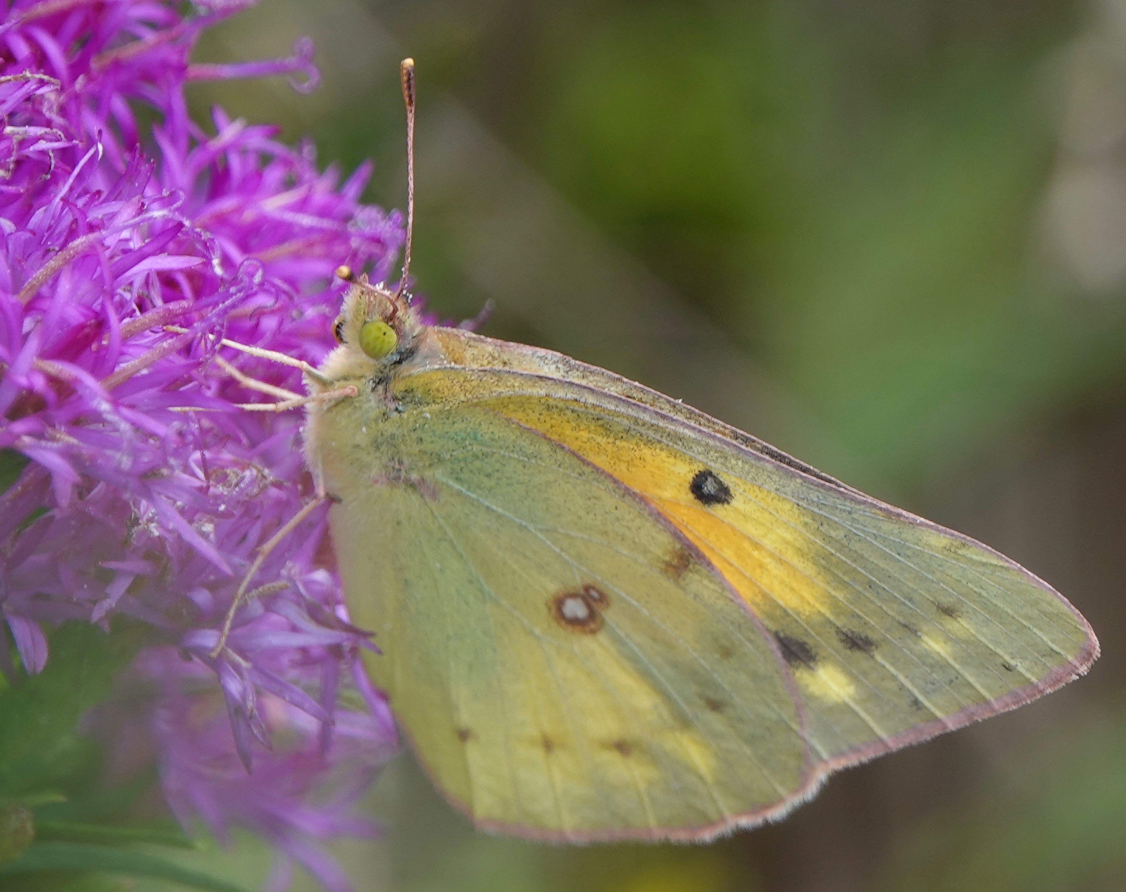 Lot of orange here, so I think an Orange Sulphur/Colias eurytheme on Ironweed.