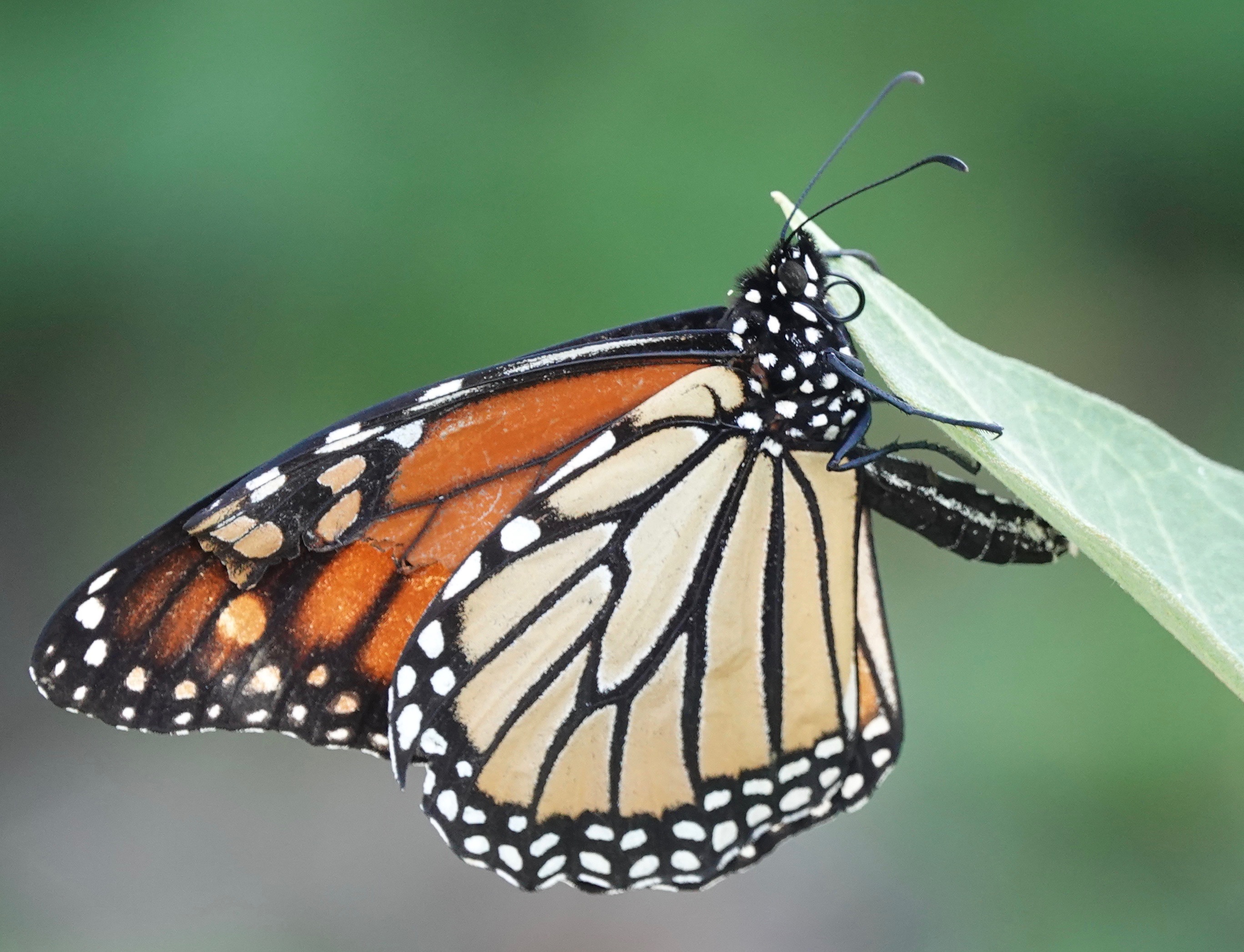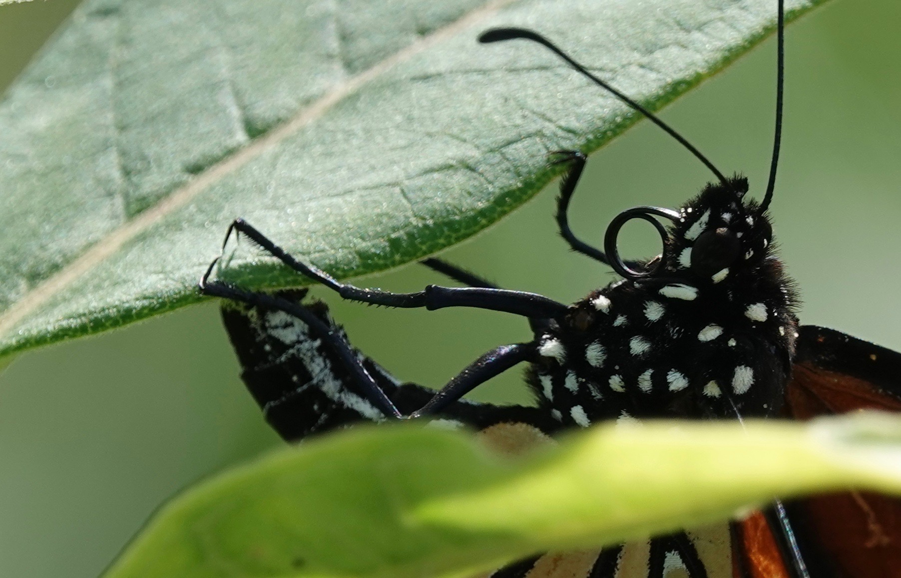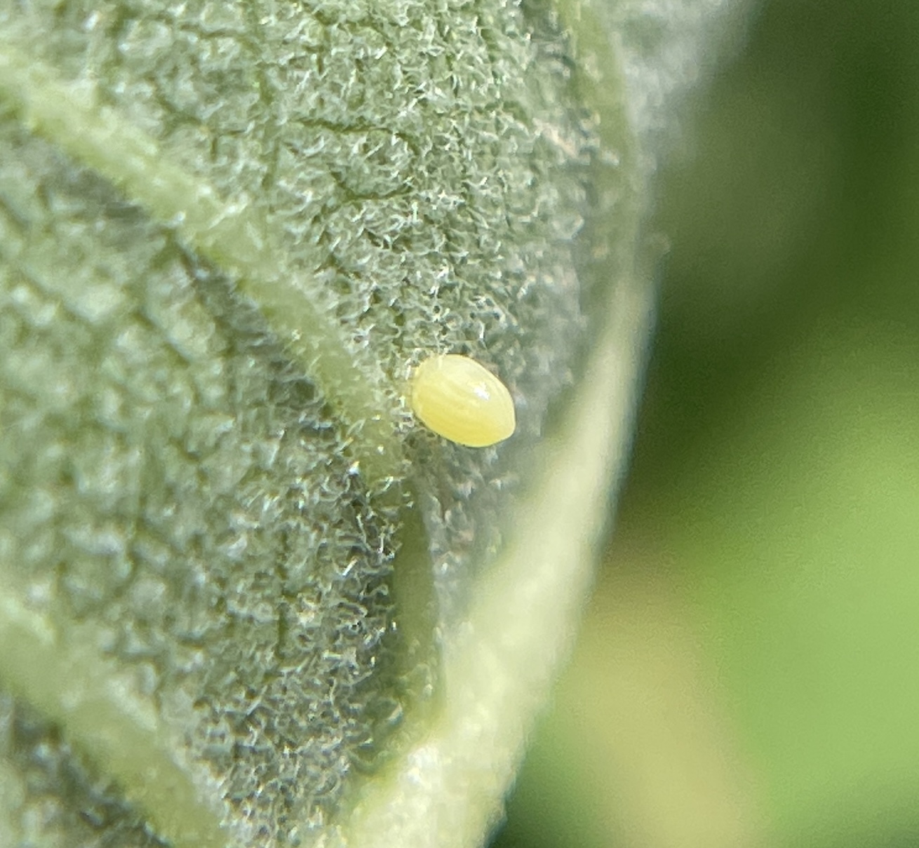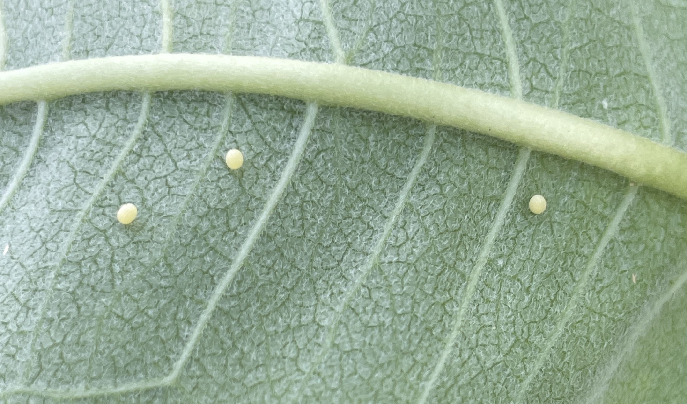 This was unusual: three eggs on the underside of the same leaf. Usually I see one egg per plant; sometimes two on the same plant, but not usually on the same leaf. I’m not sure if this particular butterfly laid any or all of these.