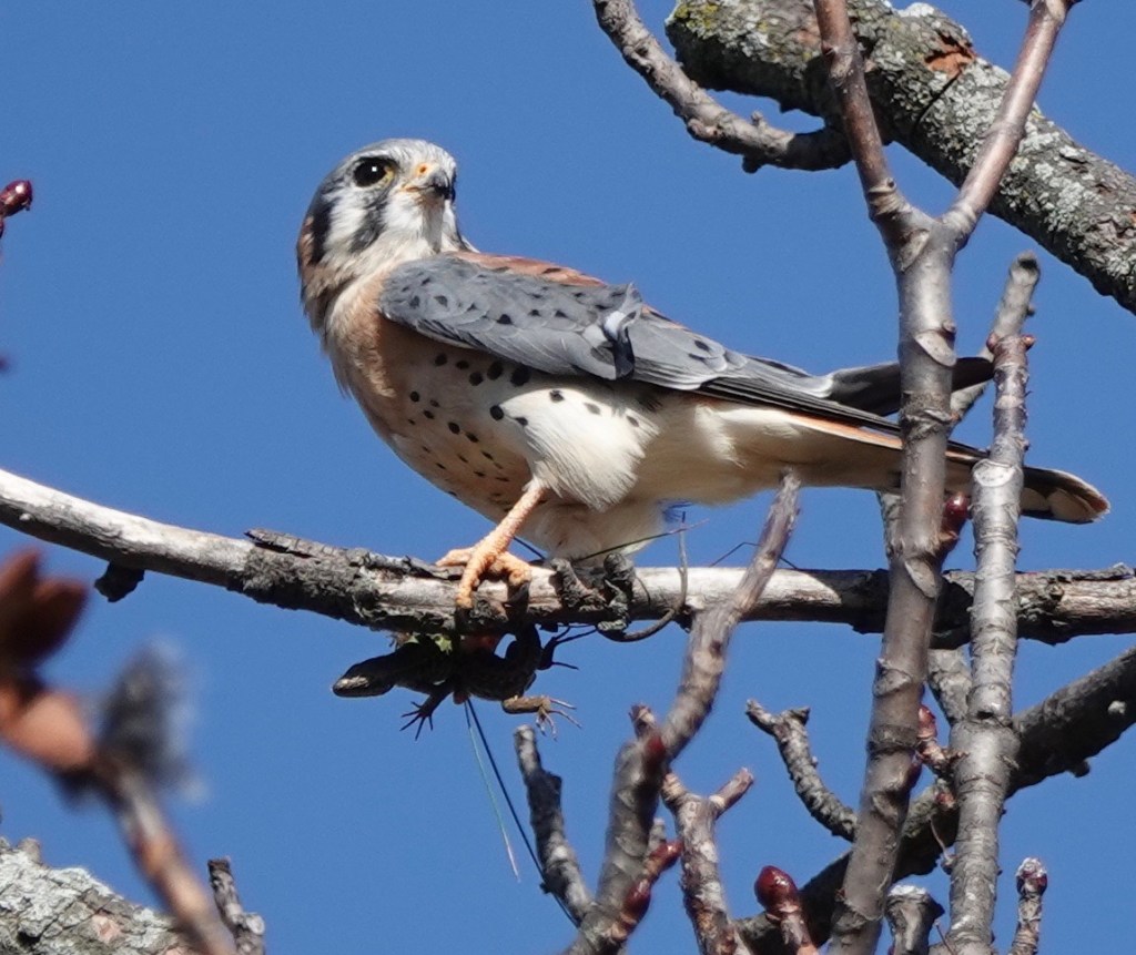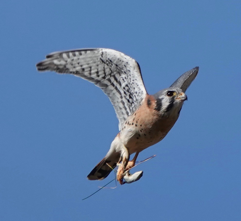 Recently, I’ve seen this male American Kestrel with songbird, dragonfly, and mantis prey. Here he has a lizard, picked off the ground along with some grasses.