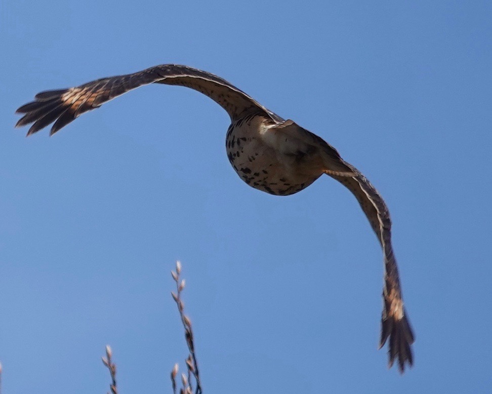 This juvenile Red-shouldered Hawk passed by. I suspect my presence made the bird veer away from the feeder.