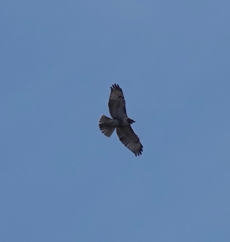 This juvenile Red-shouldered Hawk passed by. I suspect my presence made the bird veer away from the feeder.