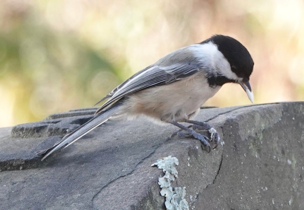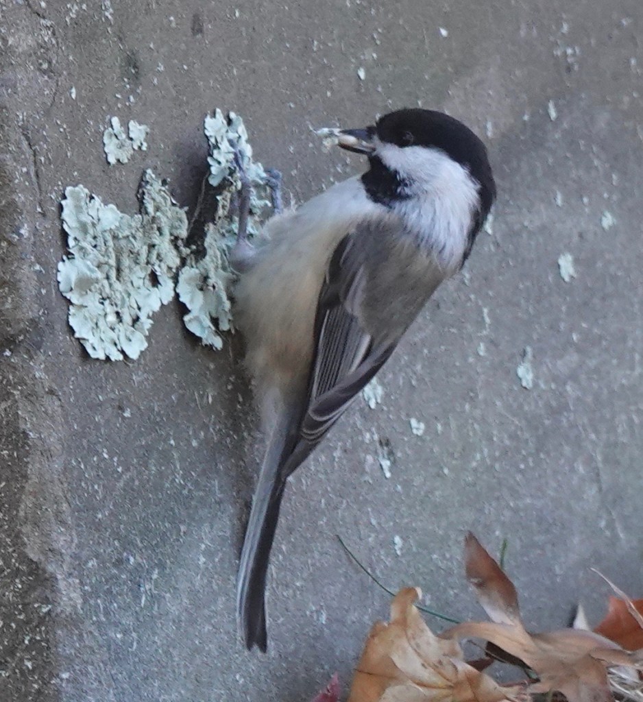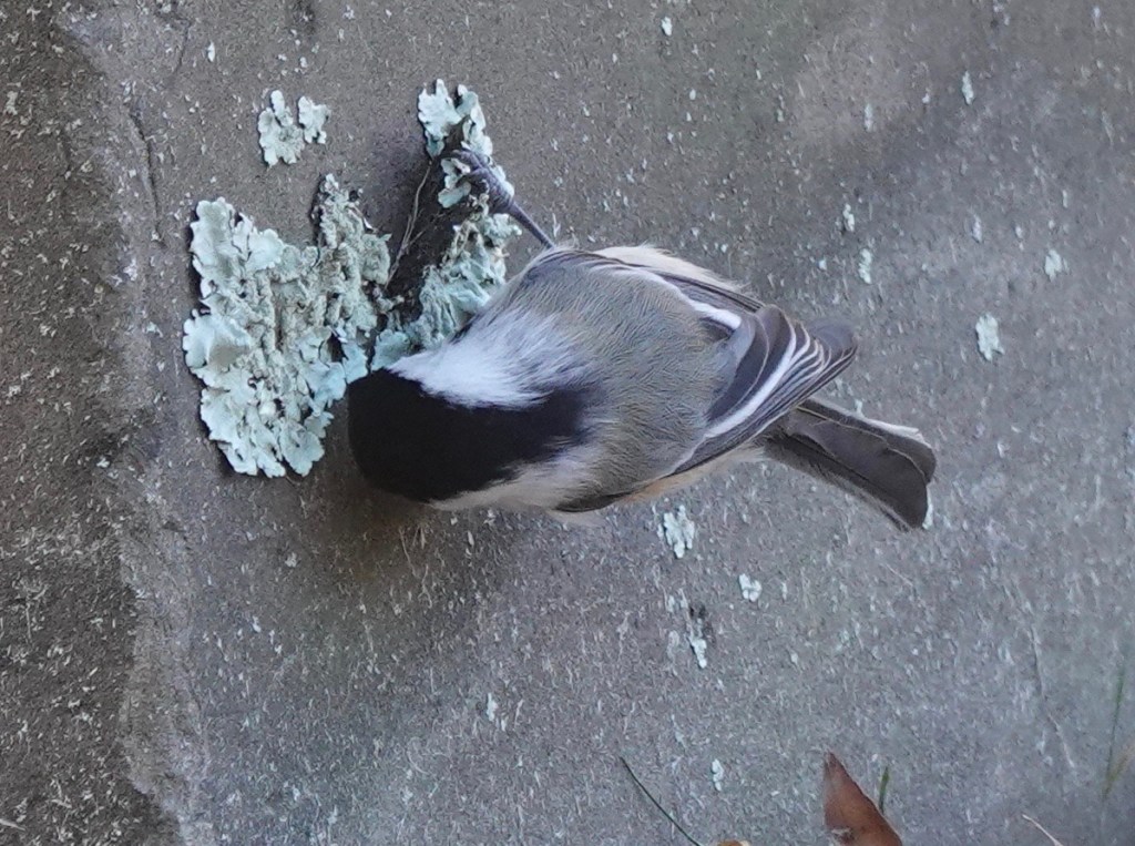 A Black-capped Chickadee took a break from the feeder to look behind clumps of lichen on tombstones.