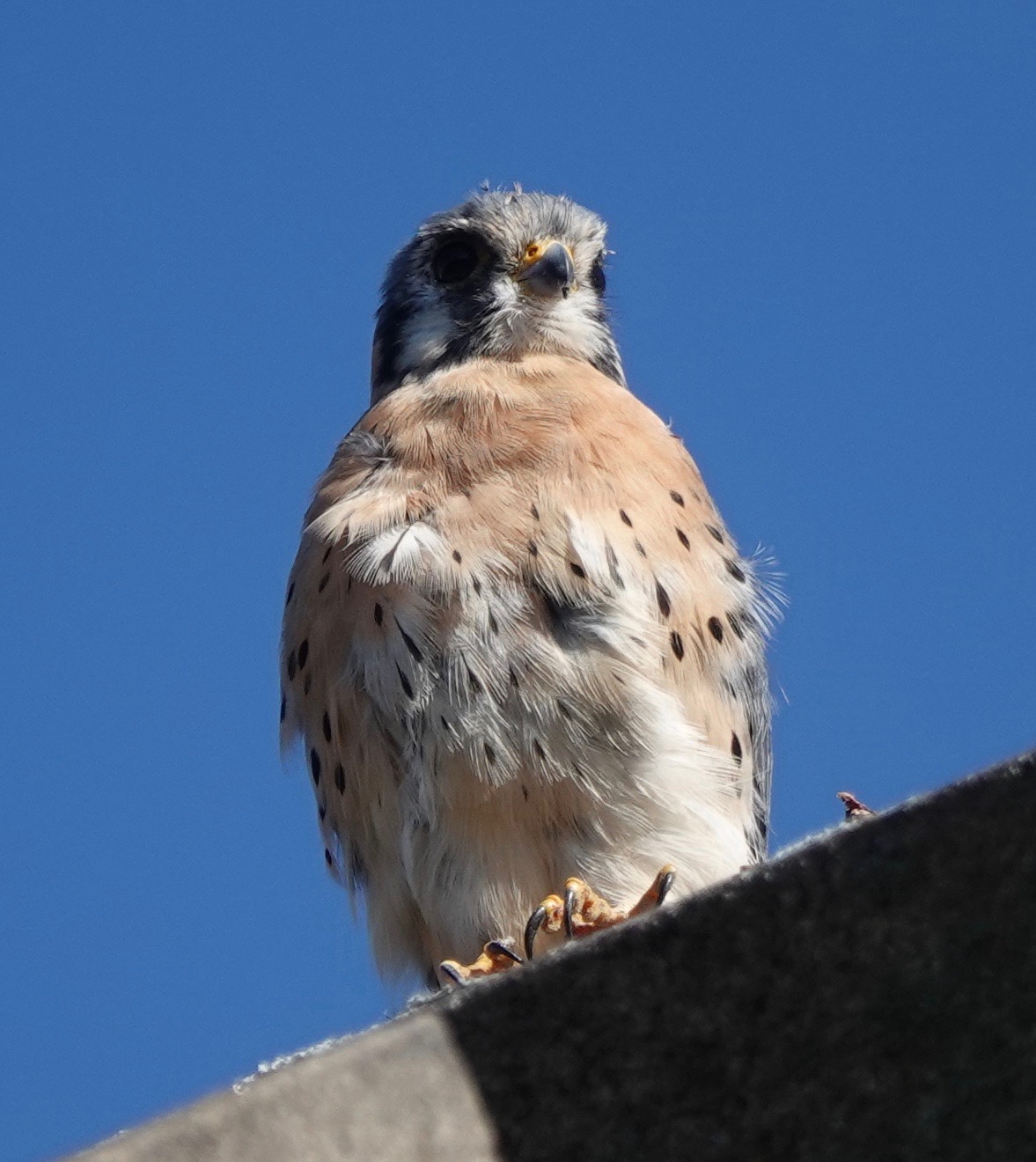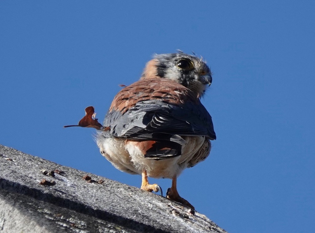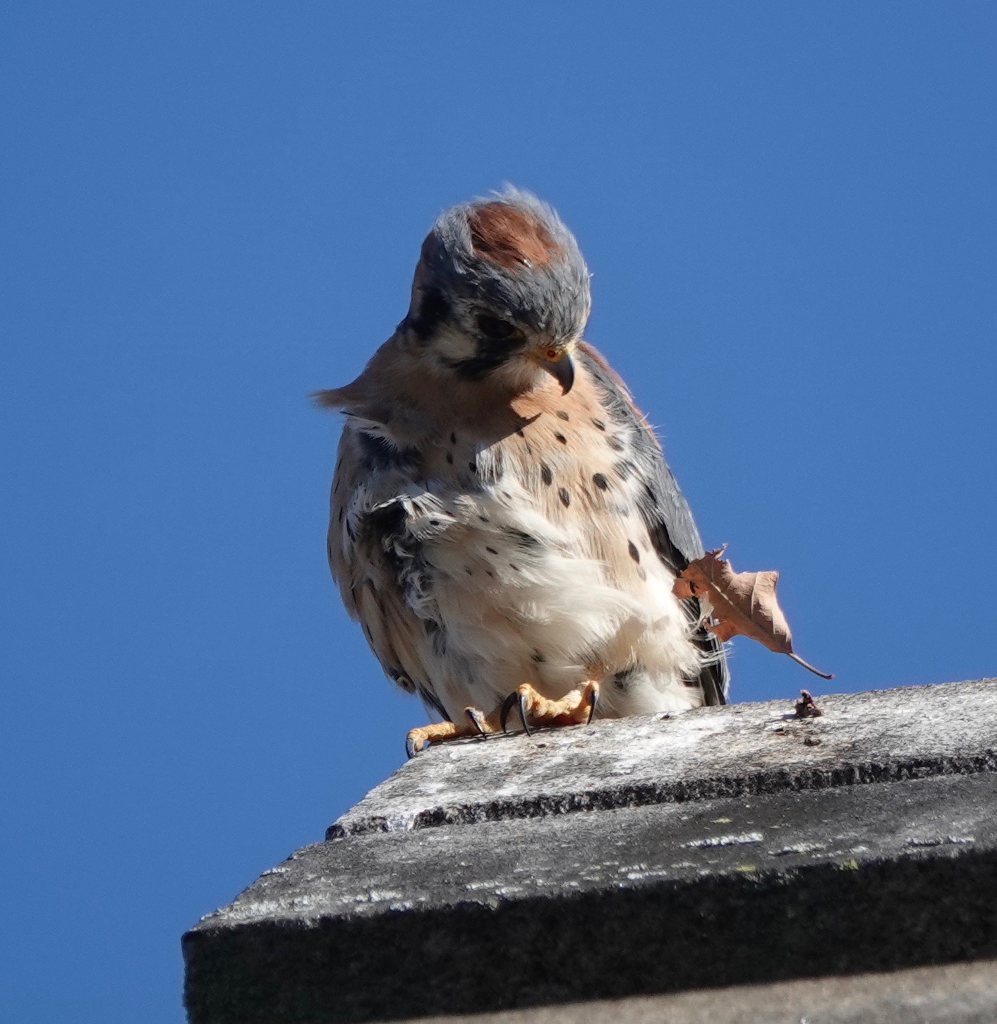 After a sortie, this American Kestrel came back with an entangled leaf.