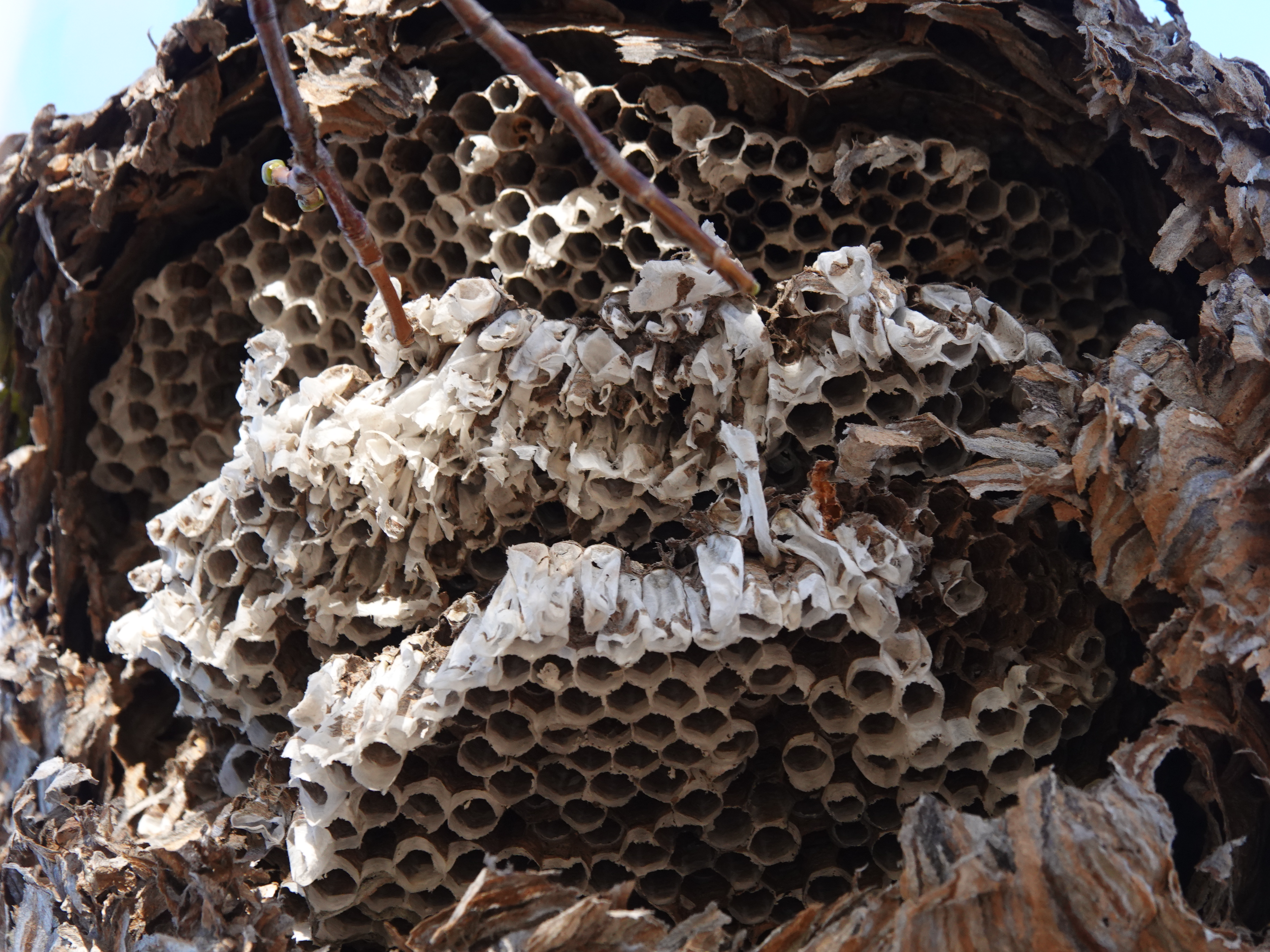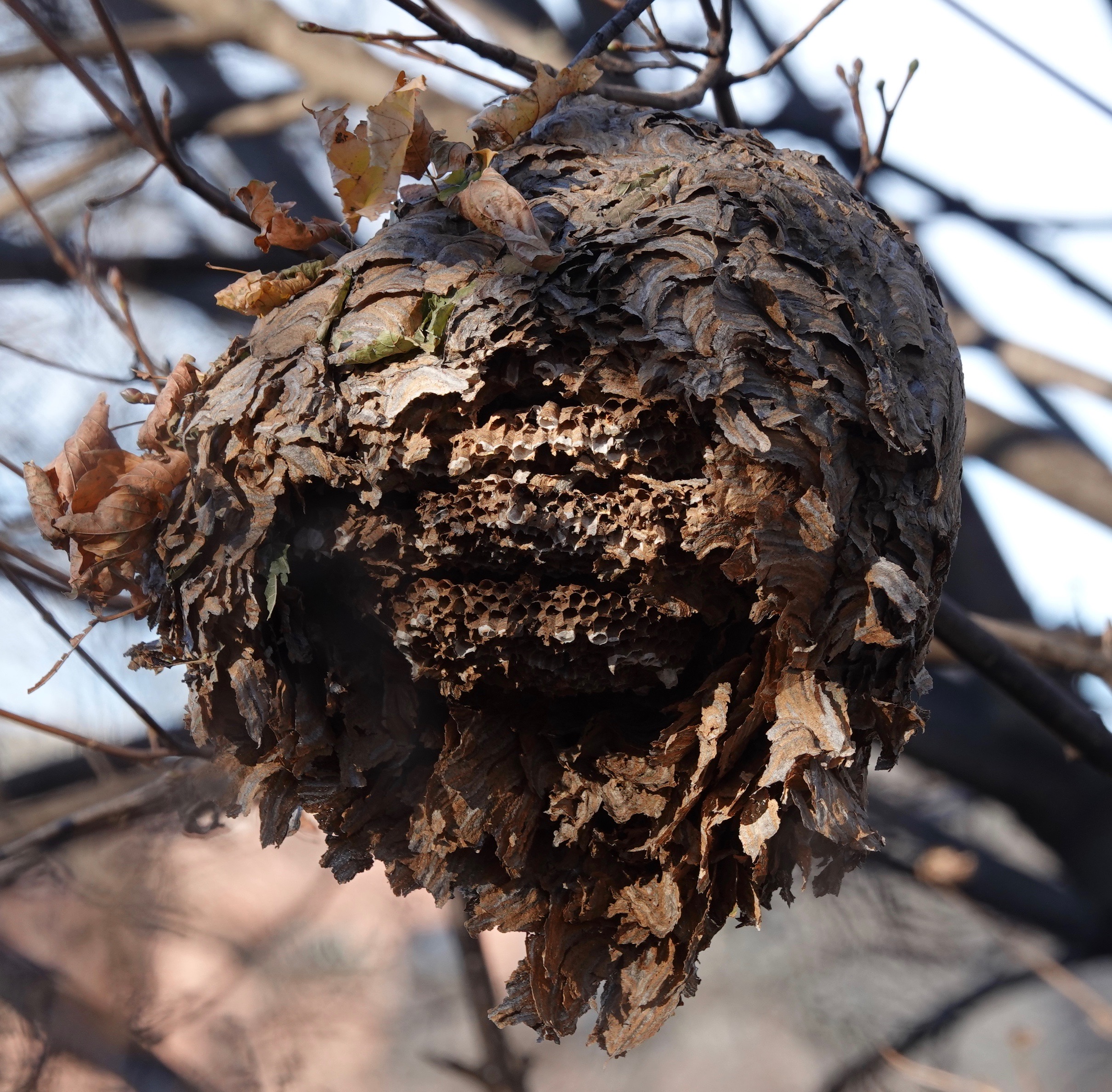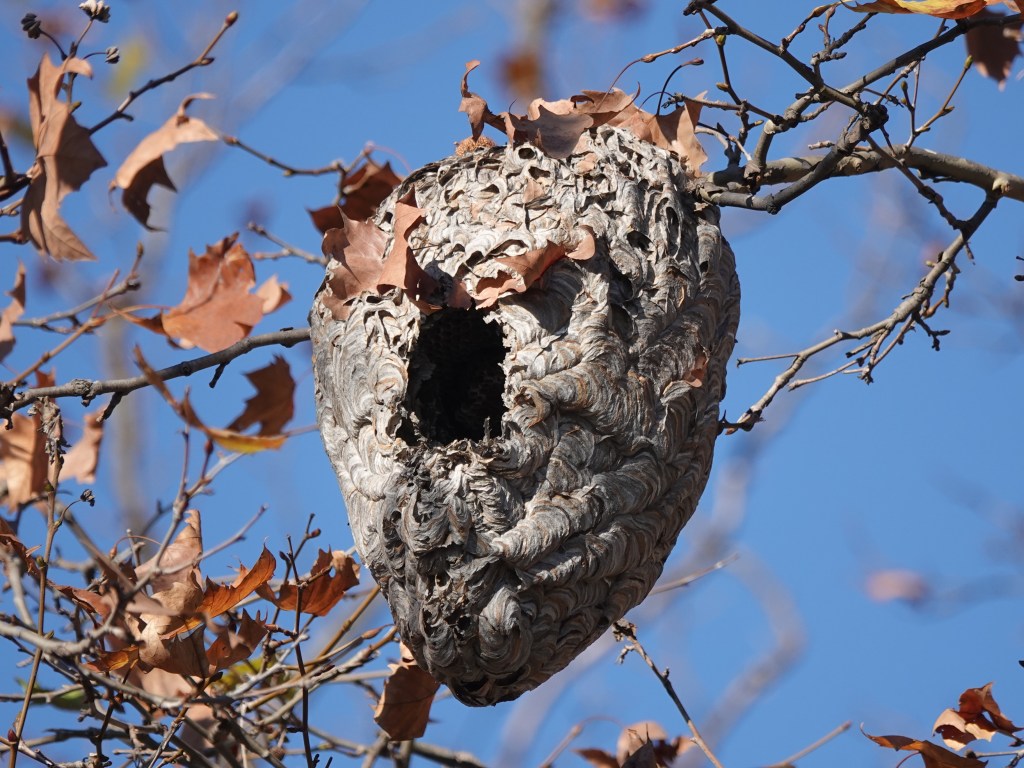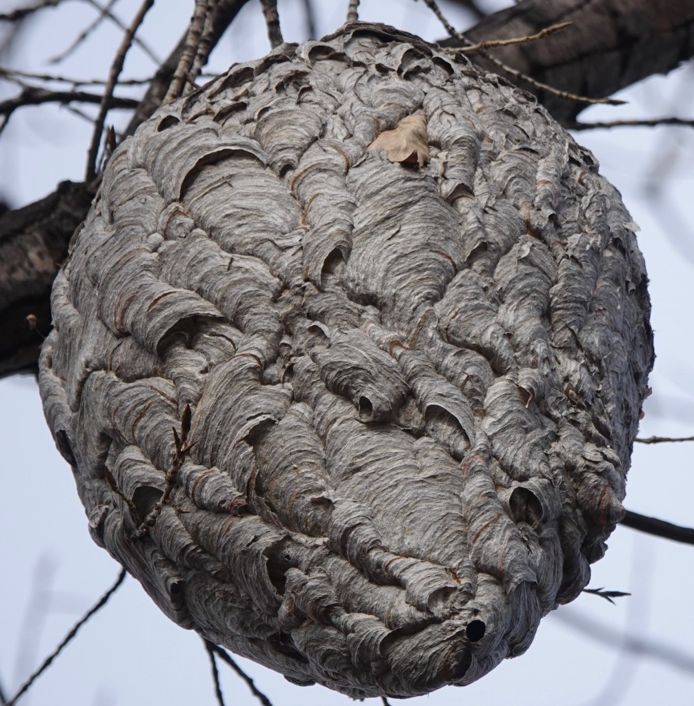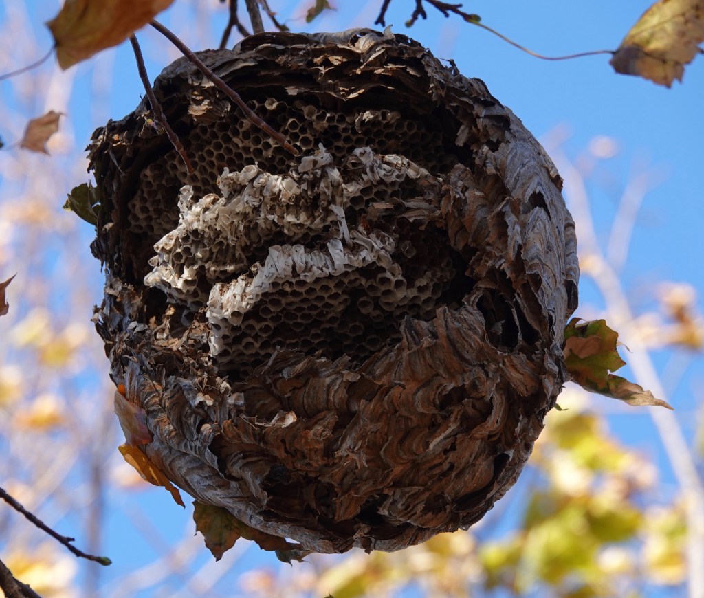 These nests are all abandoned in the fall as the wasps die off. Only mated gynes, queens-to-be, survive the winter. By spring, there won’t be much left of these nests, battered by time and the weather, if there’s anything at all.
