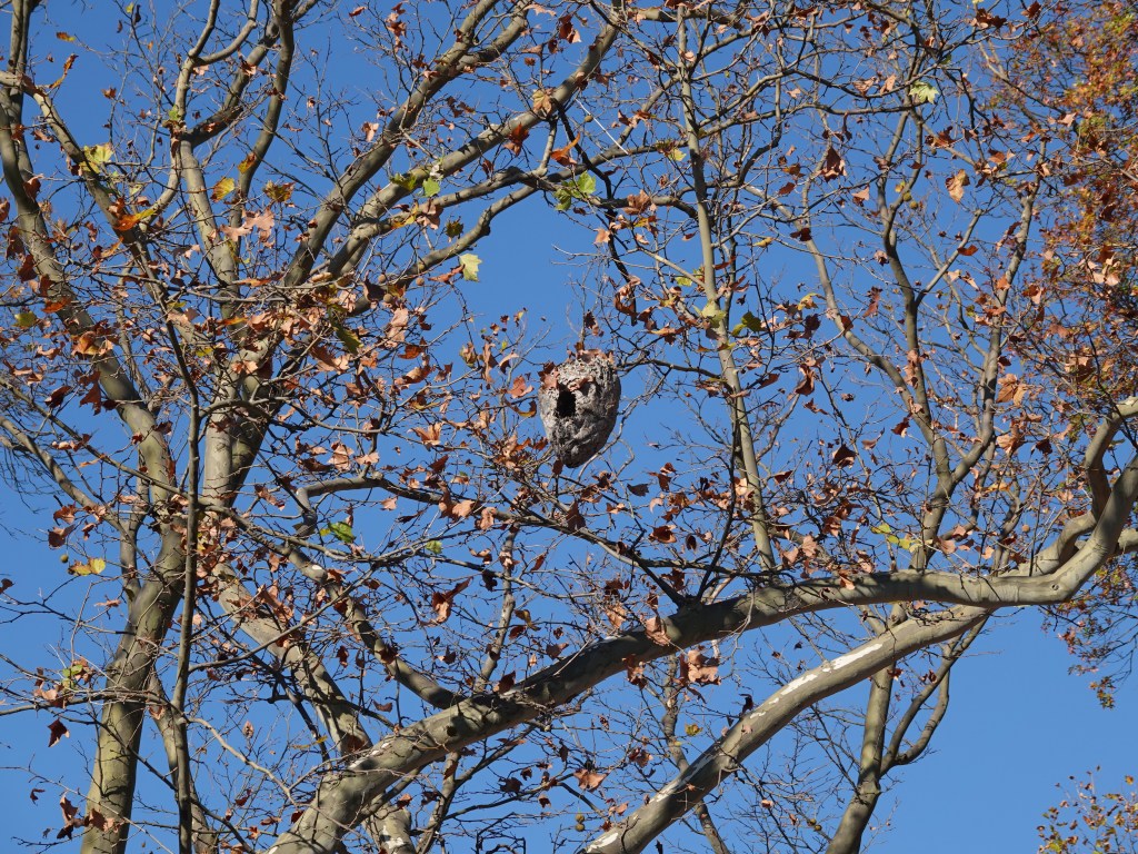 Most of the leaves have fallen, but winter’s storms are yet to come. So now’s the time to see the remains of the paper nests built up by Bald-faced Hornets/Dolichovespula maculata this year. I’m always surprised by how many of them are in my very urban neighborhood, around Sunset Park, Green-Wood Cemetery, and even the streets in-between. Here are half a dozen I’ve spotted recently.