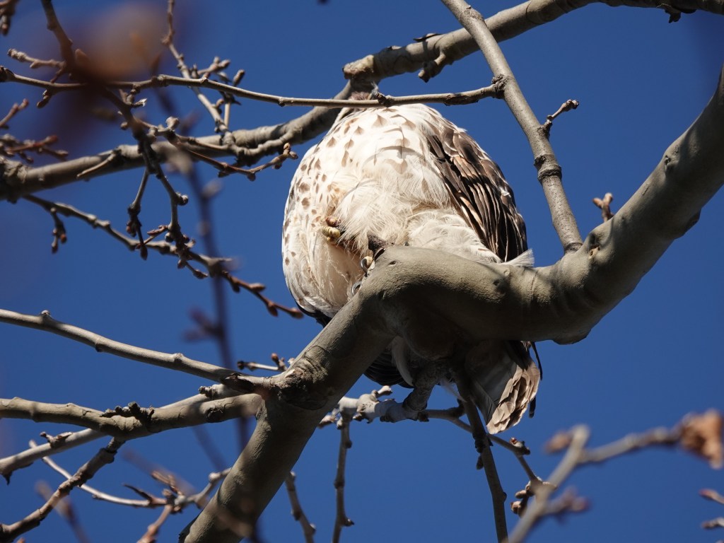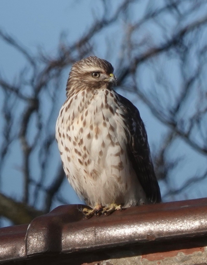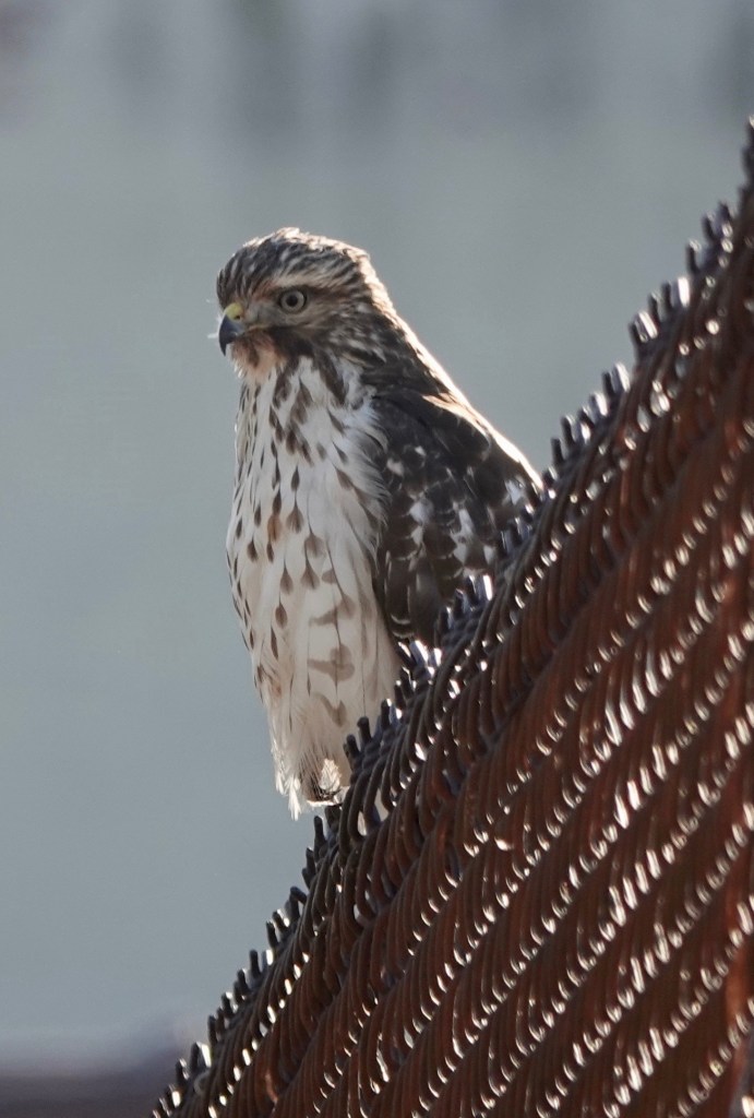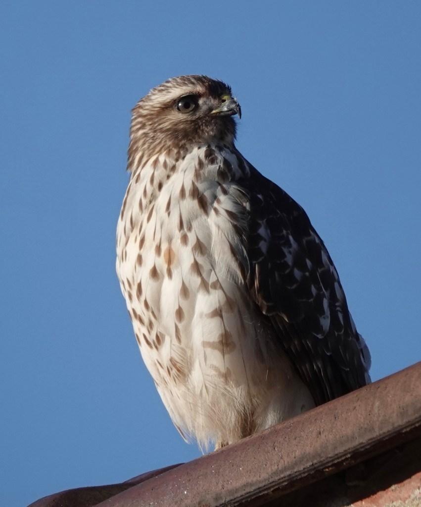 Anyway, going back to the first photo. The dark lines in the tail are roughly the size of the light lines. In first year Red-tailed Hawks, the dark lines are thinner than the light lines; combining this with the full frontal markings makes this a young Red-shouldered Hawk.