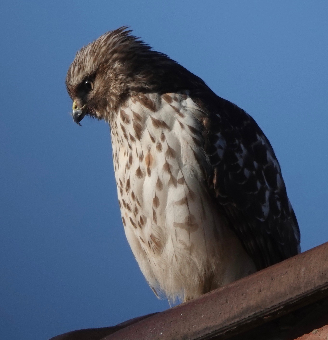 Anyway, going back to the first photo. The dark lines in the tail are roughly the size of the light lines. In first year Red-tailed Hawks, the dark lines are thinner than the light lines; combining this with the full frontal markings makes this a young Red-shouldered Hawk.