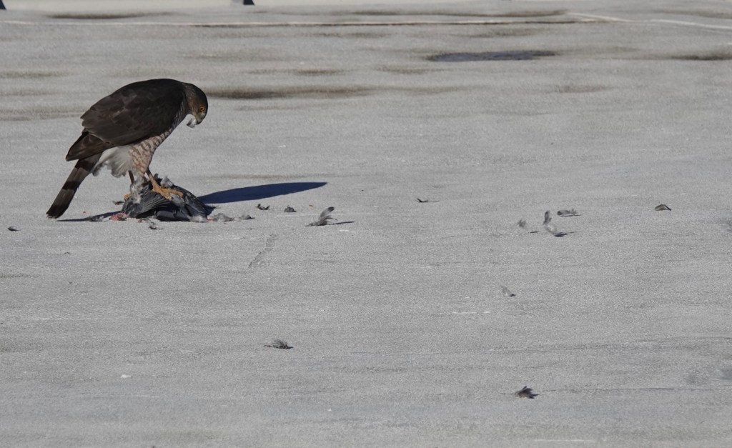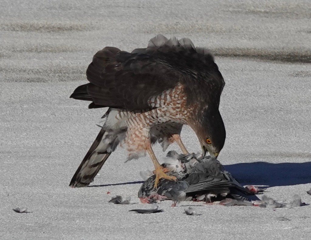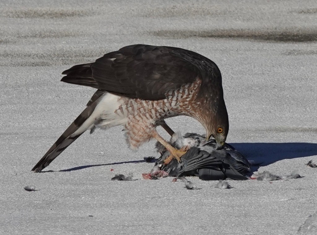 For about 25 minutes, this Coopers Hawk plucked and ate a Feral Pigeon until the next door neighbor scared the bird away, with prey firmly in grip, while trying to get a cellphone photo of the situation.