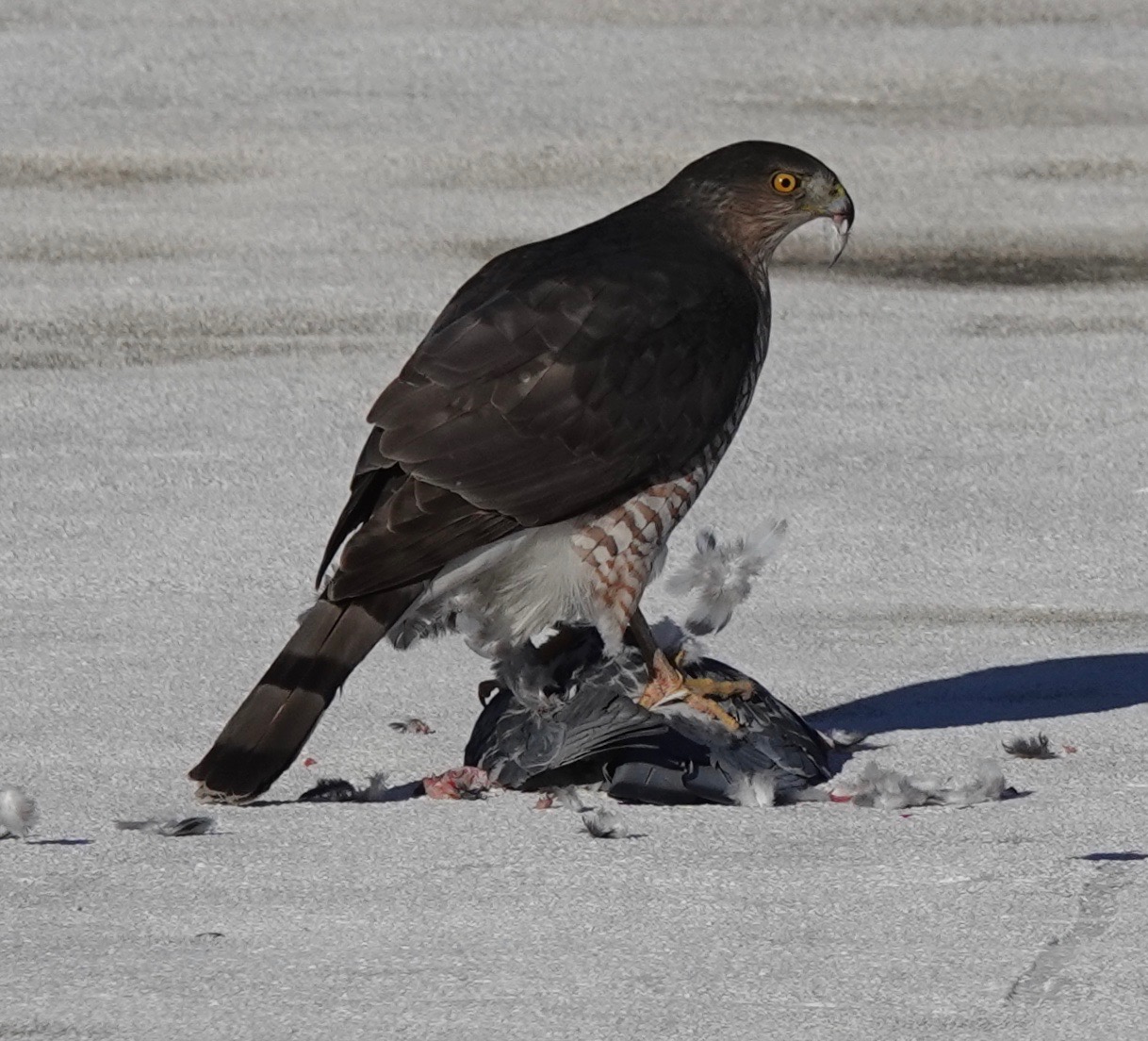 For about 25 minutes, this Coopers Hawk plucked and ate a Feral Pigeon until the next door neighbor scared the bird away, with prey firmly in grip, while trying to get a cellphone photo of the situation.