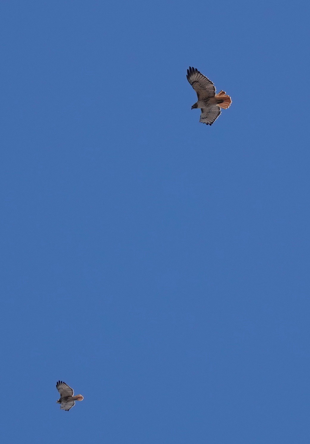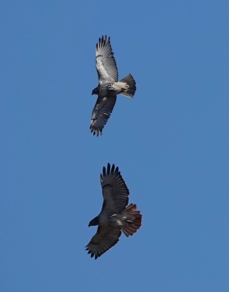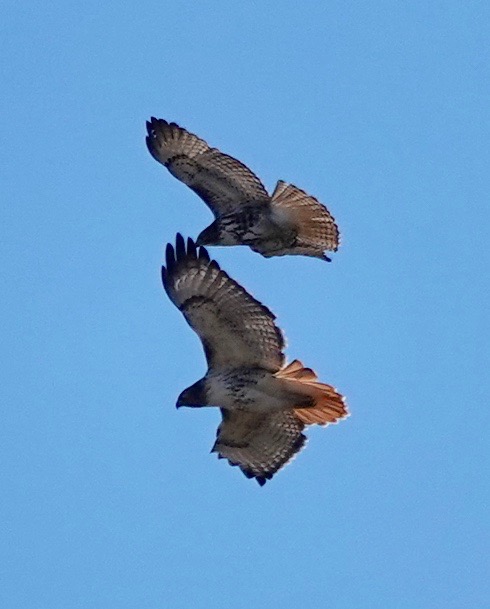 Red-tailed Hawks circling each other on various days in the last month. Courting time.