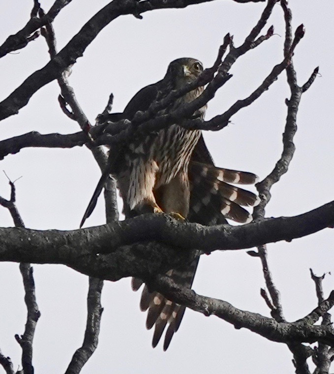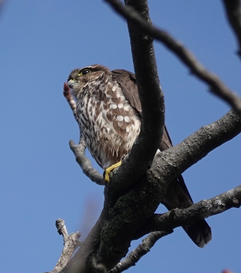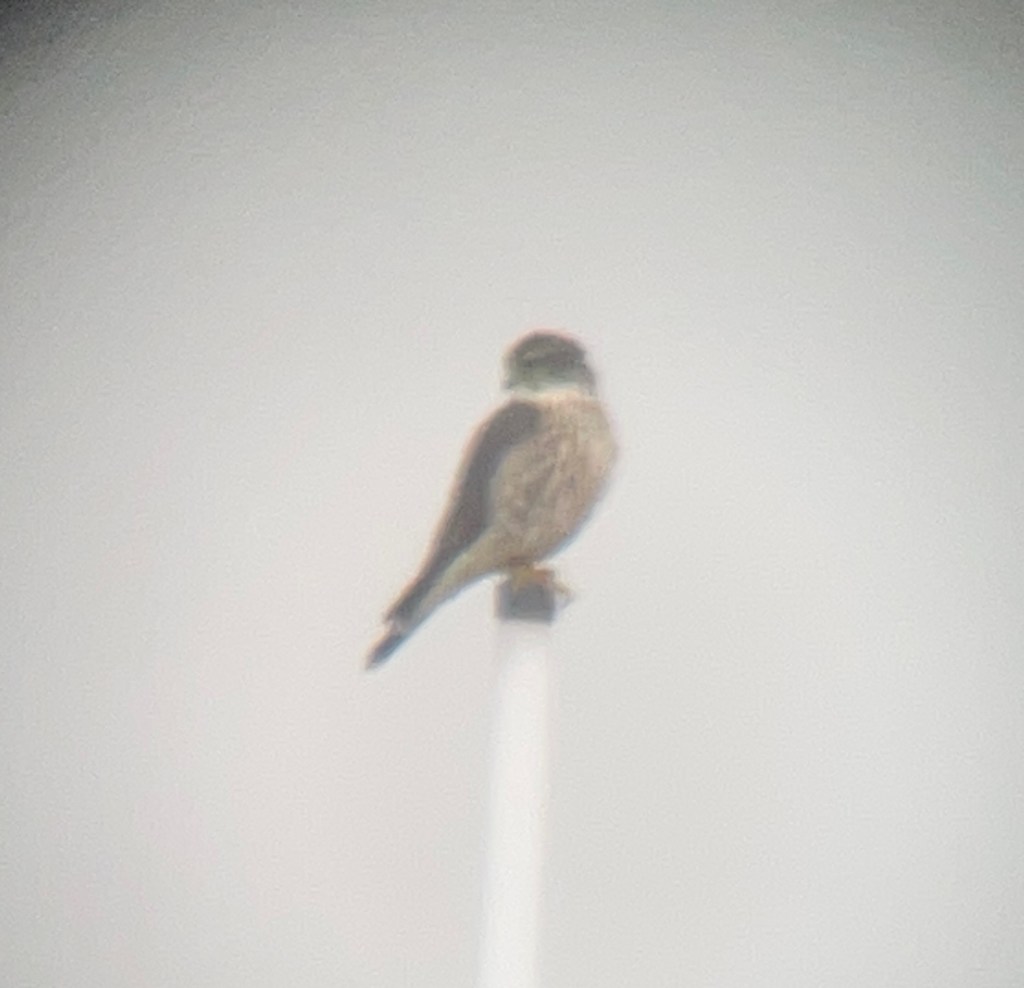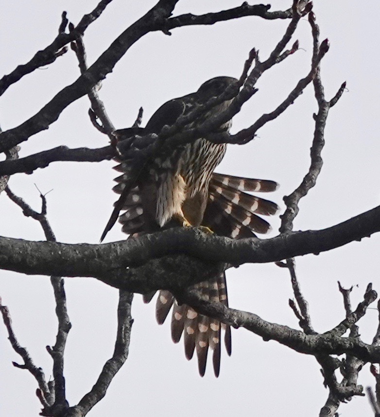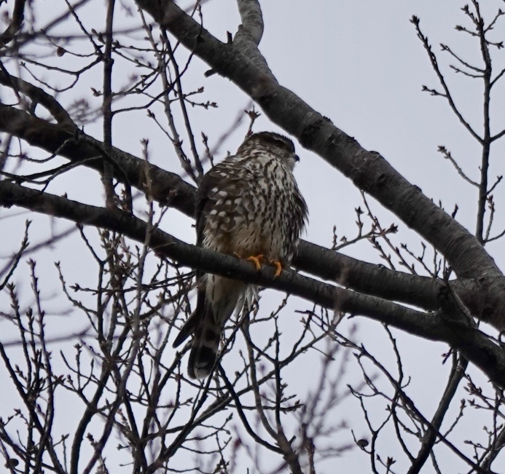 Since December, I’ve seen a Merlin perched on the antenna at 40th and 5th Avenue four or five times. Each time has been between 7:20-7:45. Merlins are known to perch for a long time on the same spot, but these are brief stops.