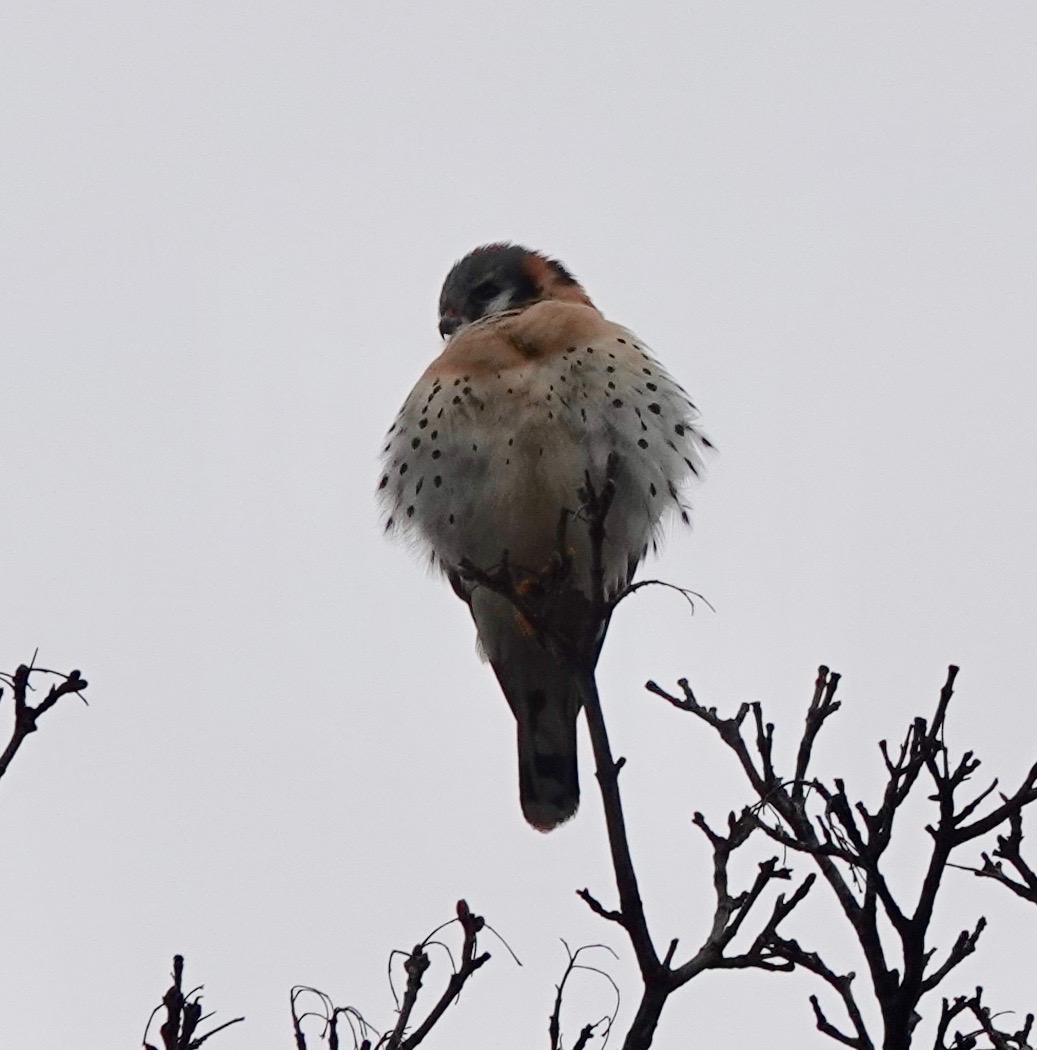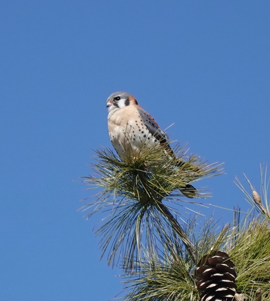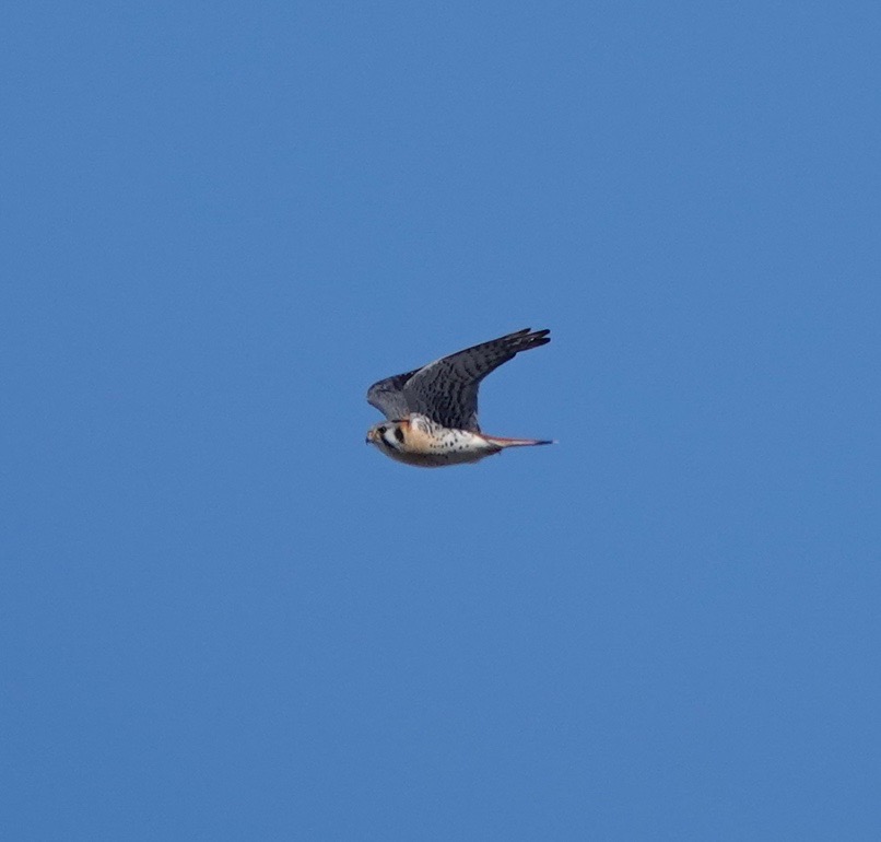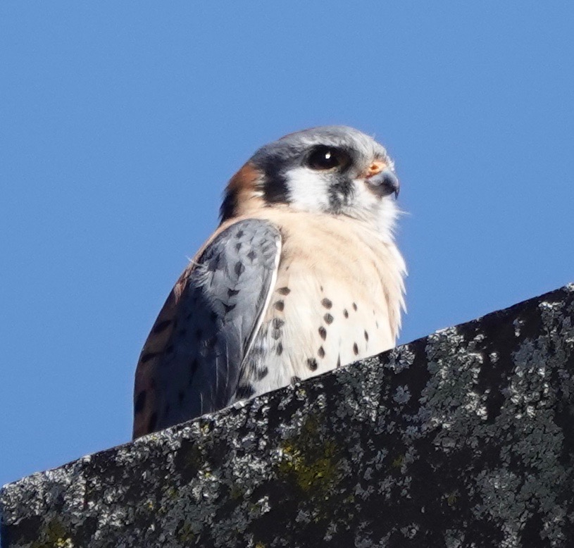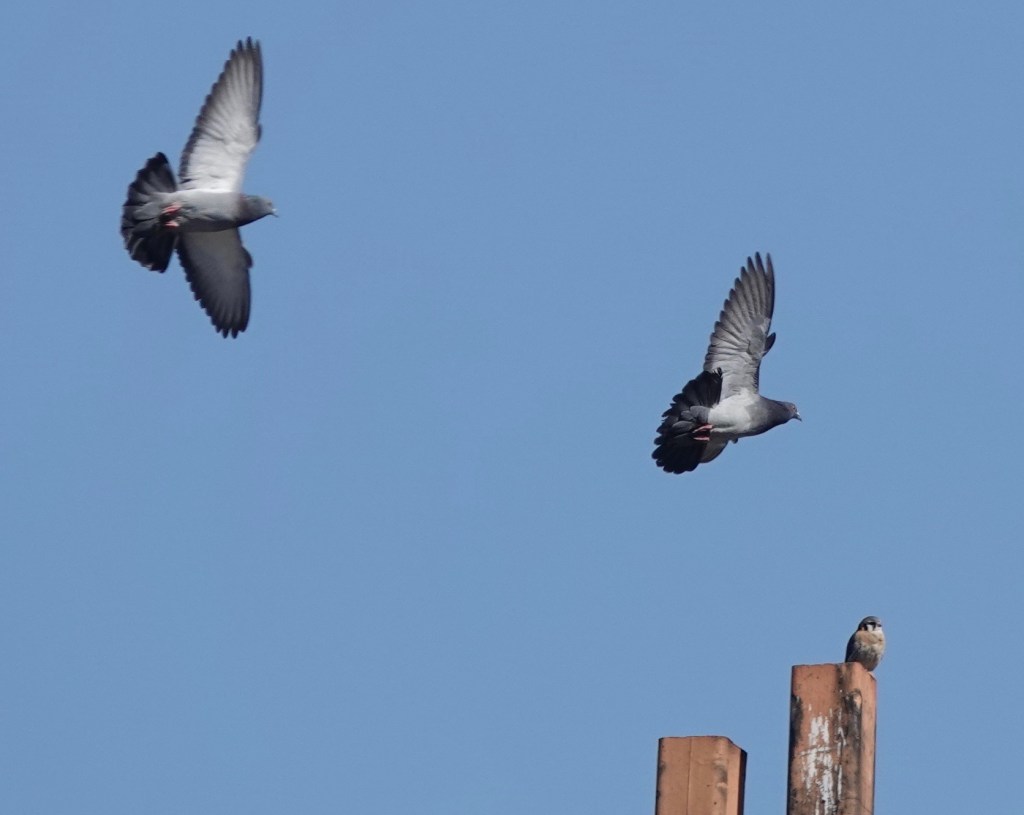 Last Wednesday, I finally saw a pair of American Kestrels on these chimney pots located above last year’s nest. (The building usually sports a cornice line of Pigeons.) The picture above was from the day before; that’s the male. (I didn’t have my camera handy when I saw the two little falcons up there together).