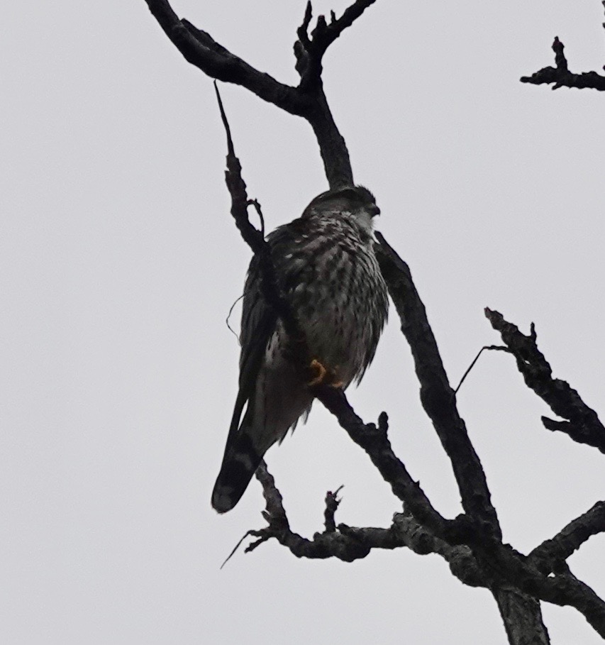 How many Merlins are around? These last two pictures were from a very overcast day; when we had three sightings of Merlin. The first two sightings were probably the same bird, being in the same tree an hour or so apart; but the third, pictured below, was outside Green-Wood by a couple of blocks.