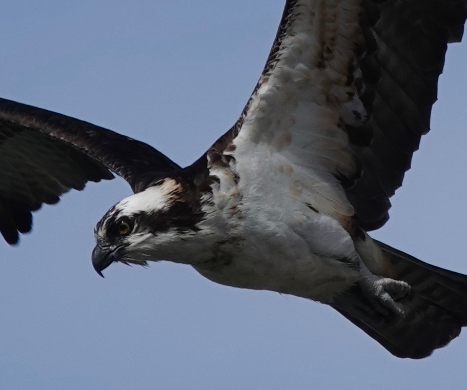 This one is banded, but those federal bands are pretty hard to read unless the bird is in hand. In years past, Osprey nesting in Jamaica Bay Wildlife Refuge were satellite-tag and tracked to (fall) and from (spring) Colombia. The destination was the same for some who nested on Nantucket Island. (It takes about two weeks to make the trip.)