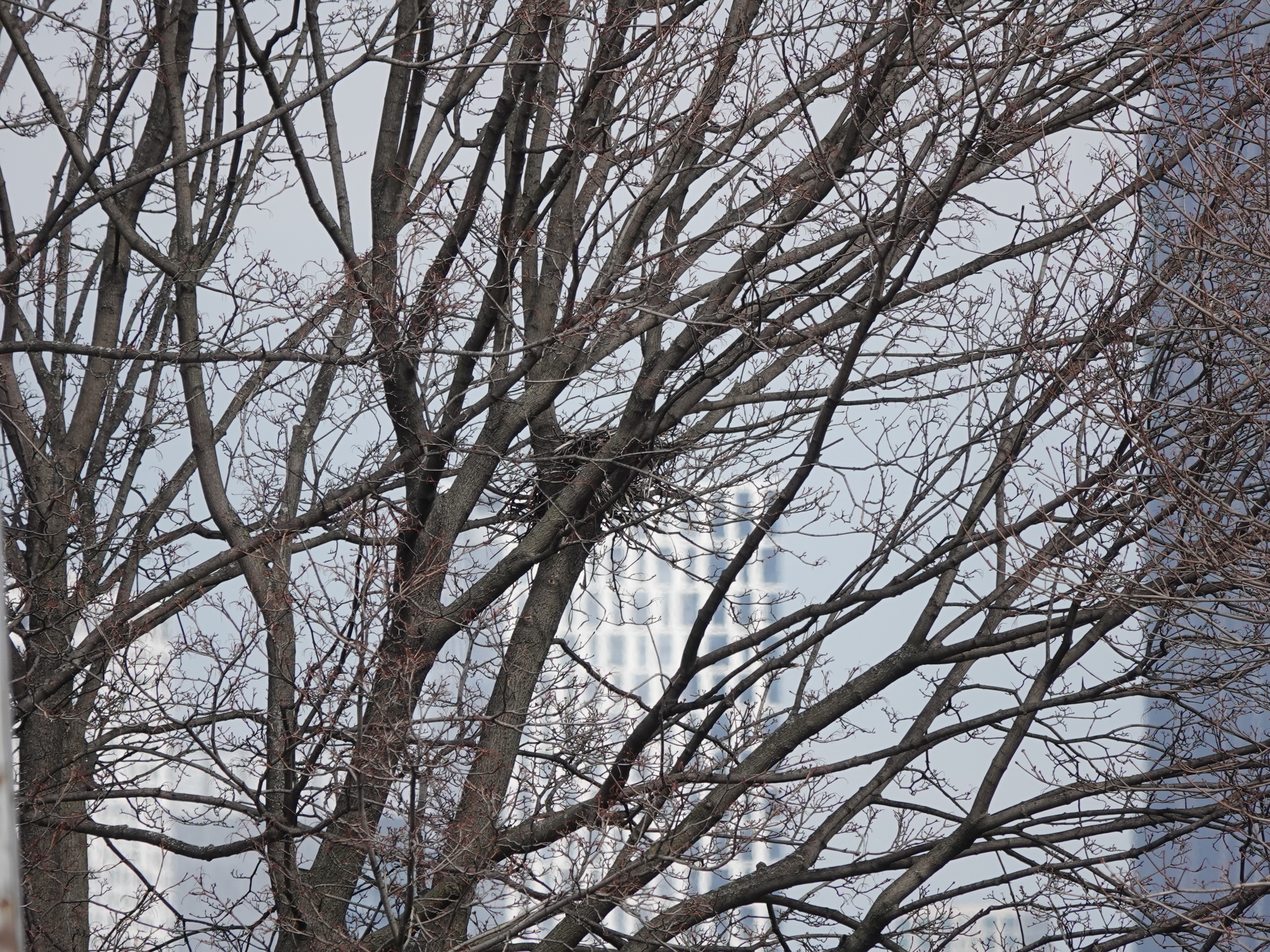 On the left through the trees is one of the big lights for the MTA yard. Looks like that’s where the partner crow is hanging out. Their nest is to the right.