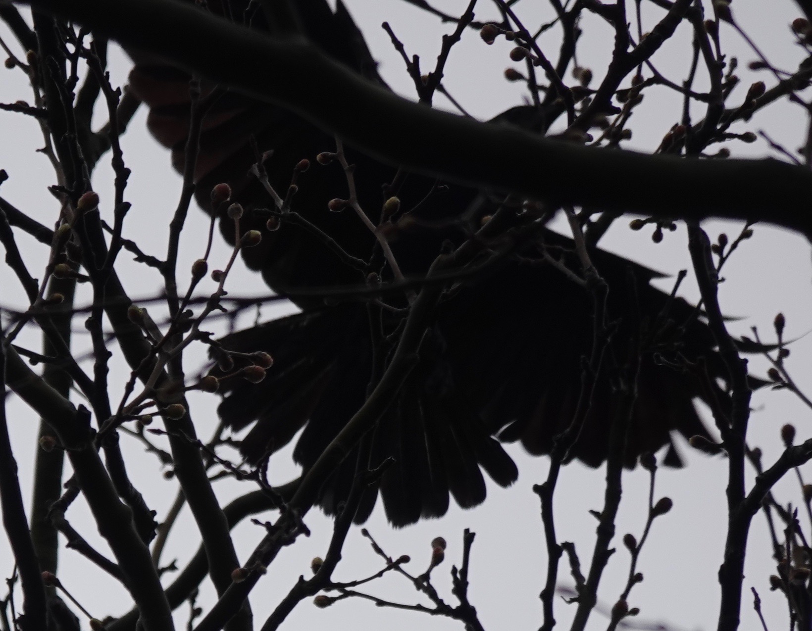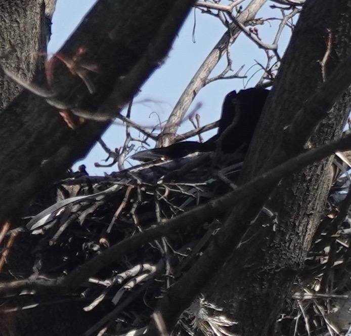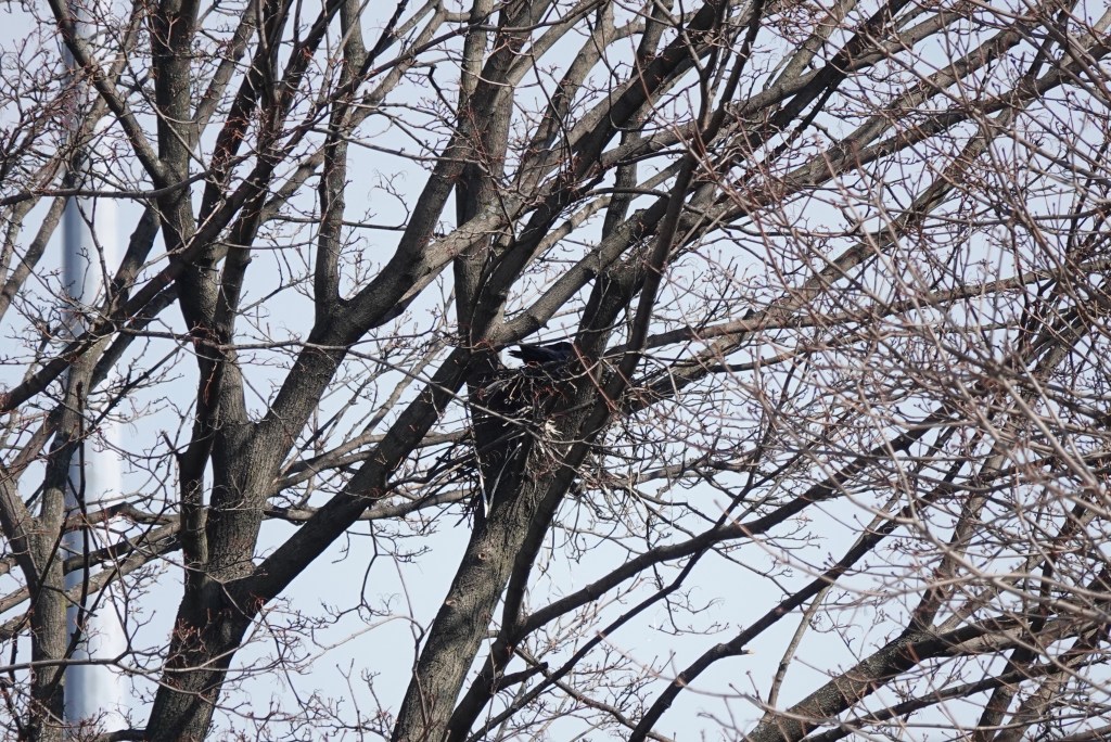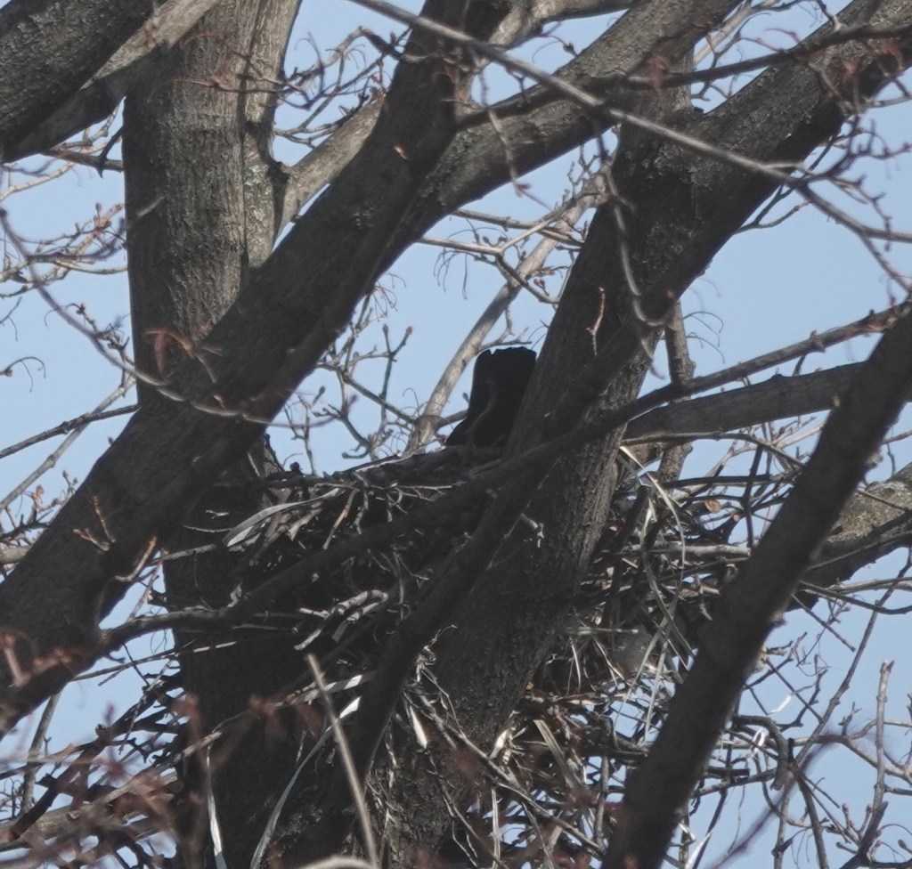 Days passed. Once, when I was going by without a camera (it happens), I saw a crow perched near the nest. Then on March 30th, I managed to photograph somebody in the nest.