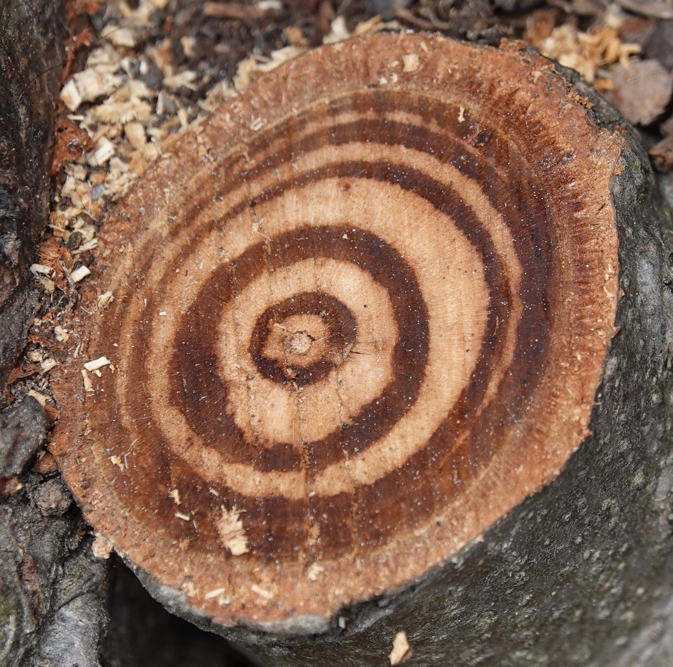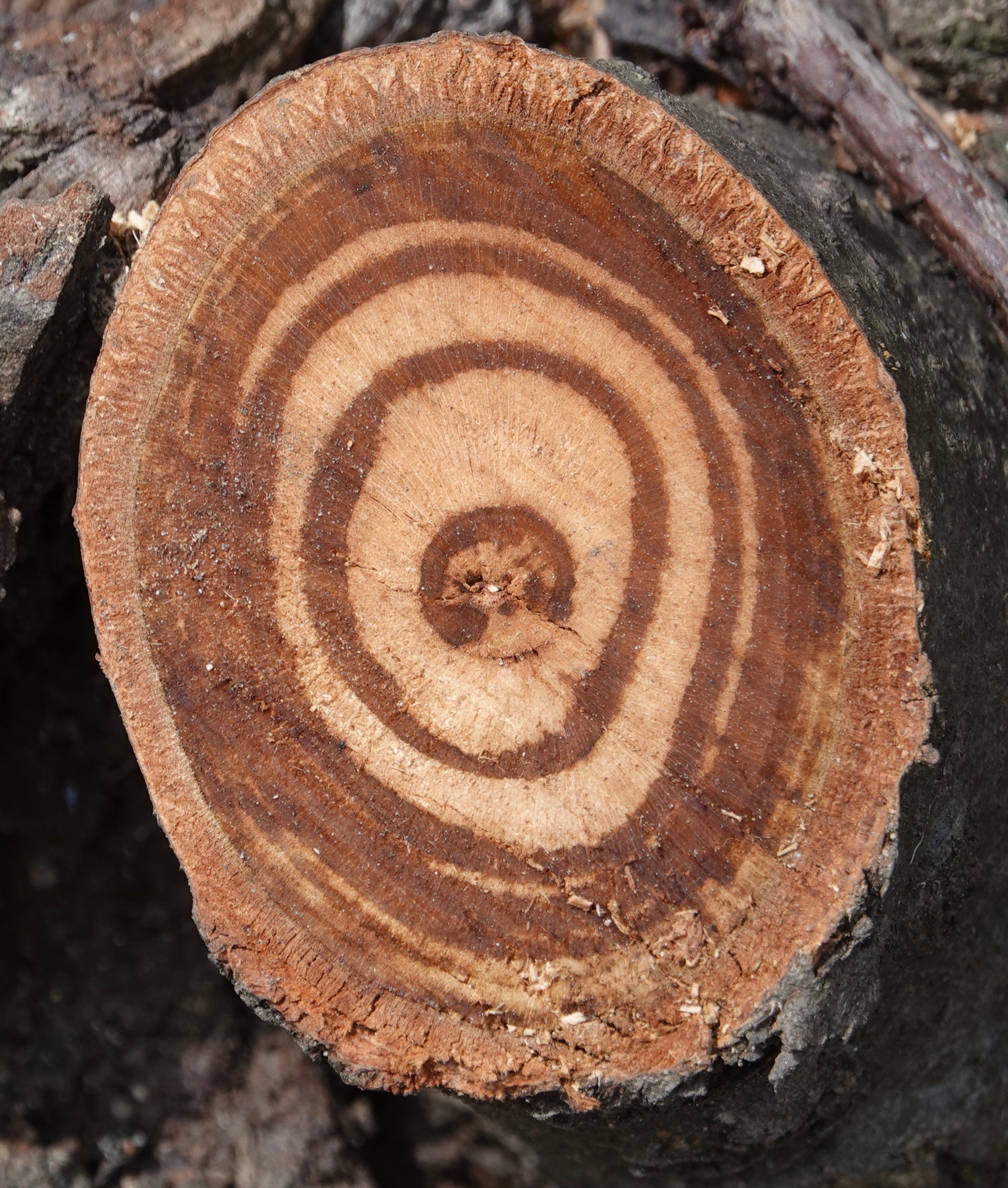 The “design” of the outermost layer – ‘ring?’ – of the tree with those chocolate-and-vanilla inner rings – the repeated, graceful X-like pattern of its exposed structure – strikes me as suggesting the invisible complexity of tree growth. Totally fascinating.