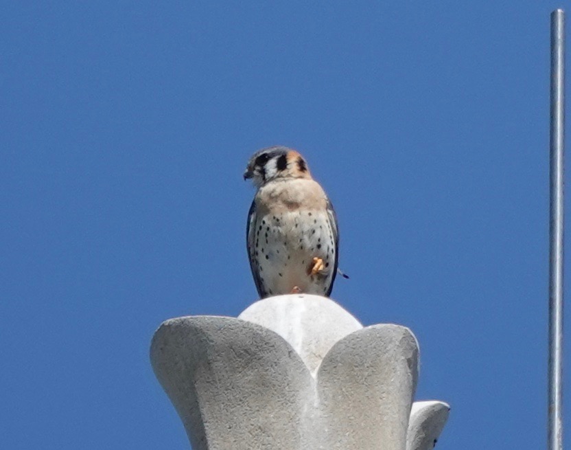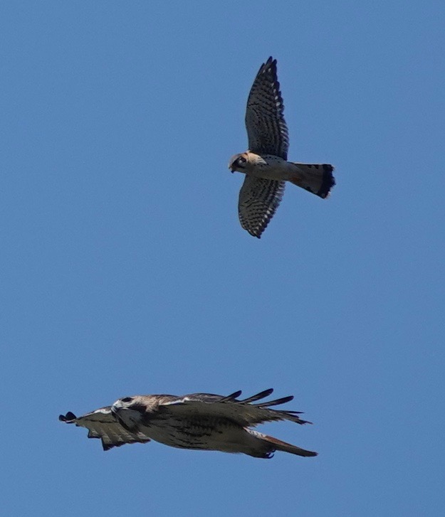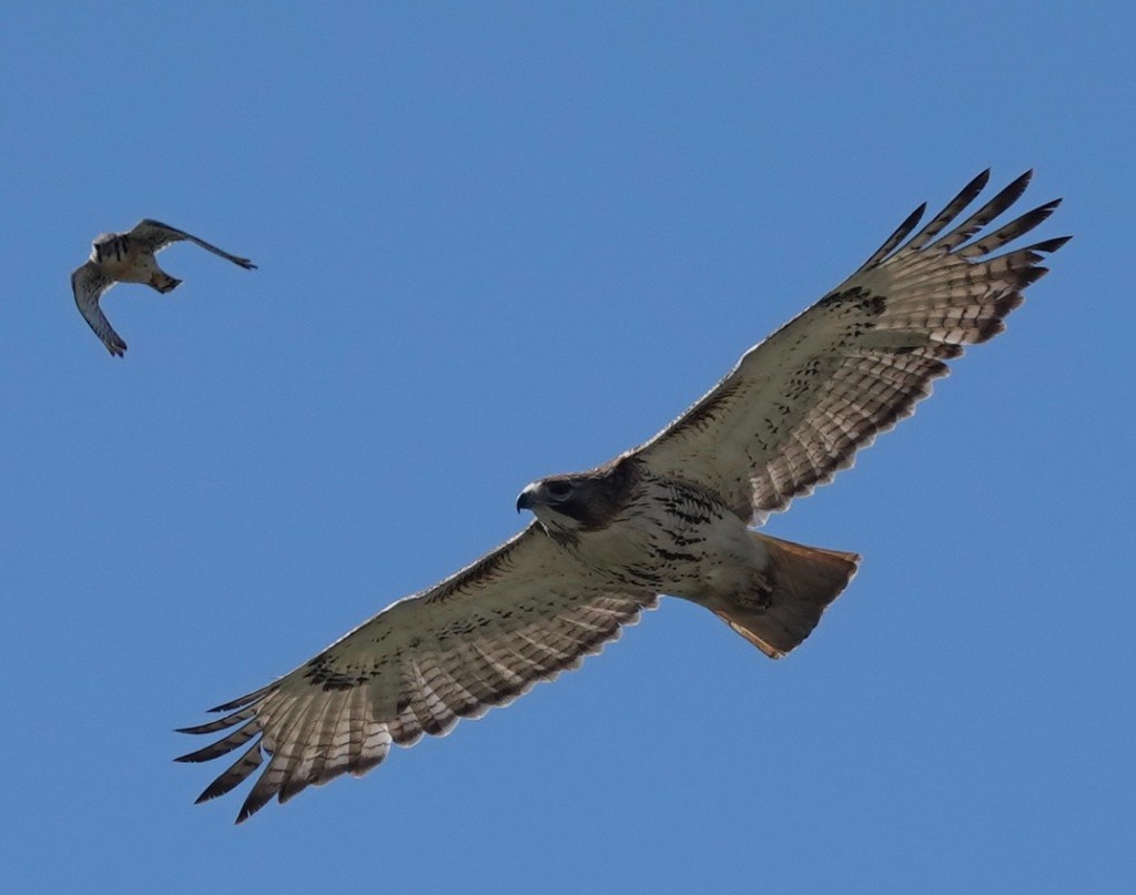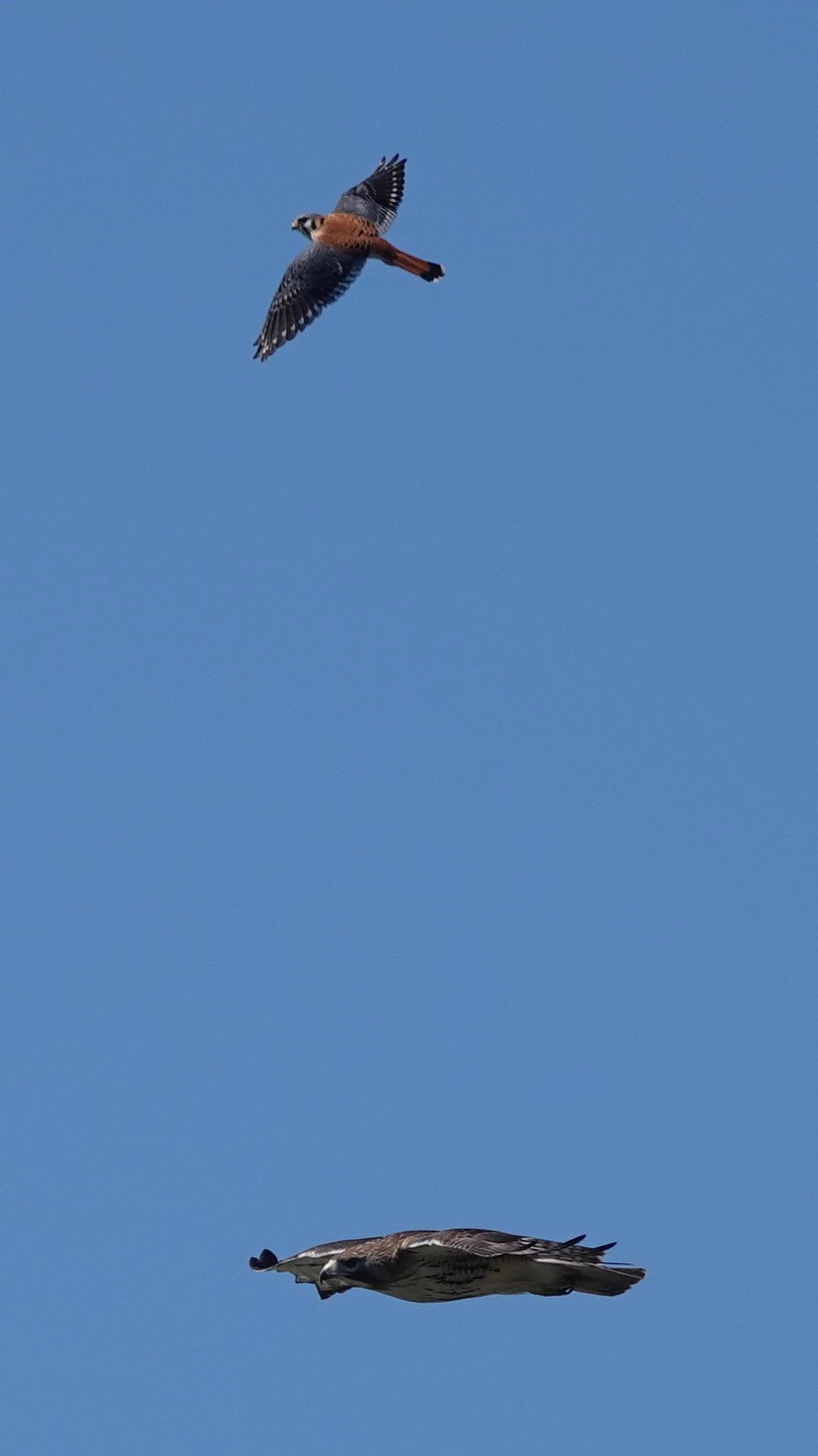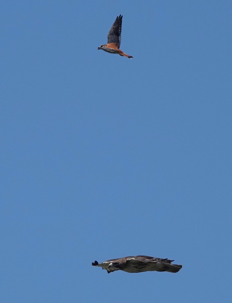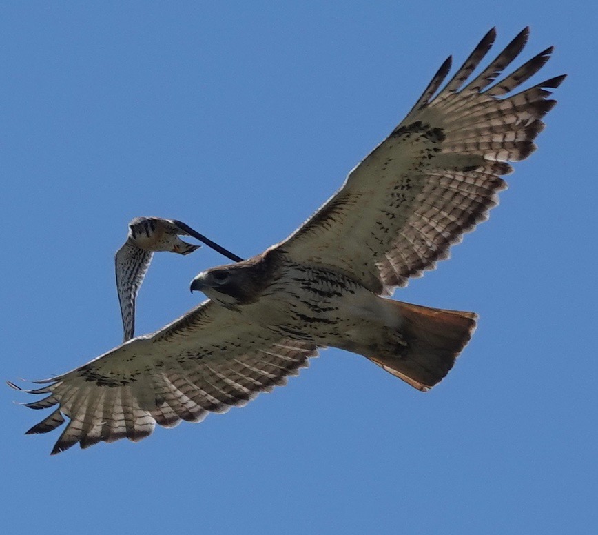 I’ve been seeing this a fair amount lately. It’s nesting season, and small birds will go to great lengths to protect their own. Blue Jays, Grackles, Red-wing Blackbirds, and plenty of smaller species, sometimes in mixed groups, will go after crows and hawks in their nesting territory. The Kestrels, who are in turn mobbed by Blue Jays, really have a thing for Red-tails. Blue Jays themselves, not above nest-raiding, also get the treatment from smaller song birds.