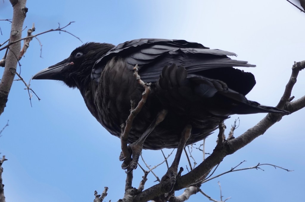 On Sunday, we found one of the four Raven puppies out of the nest, in the only clump of trees in this industrial, parking lot zone.