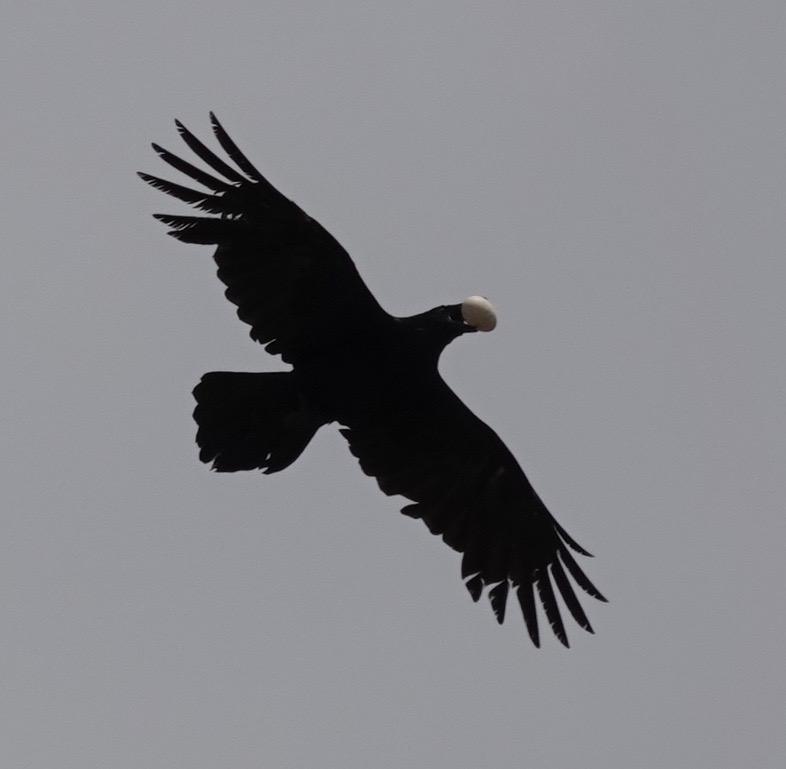 Still reporting on last Sunday’s Raven scene. Here’s one the adults transporting an egg. Definitely one of their favorite foods. I once saw them take individual eggs from a Costco 18-pack.