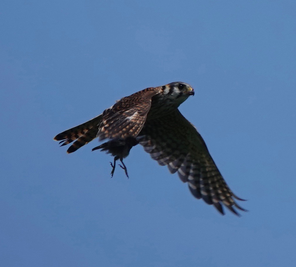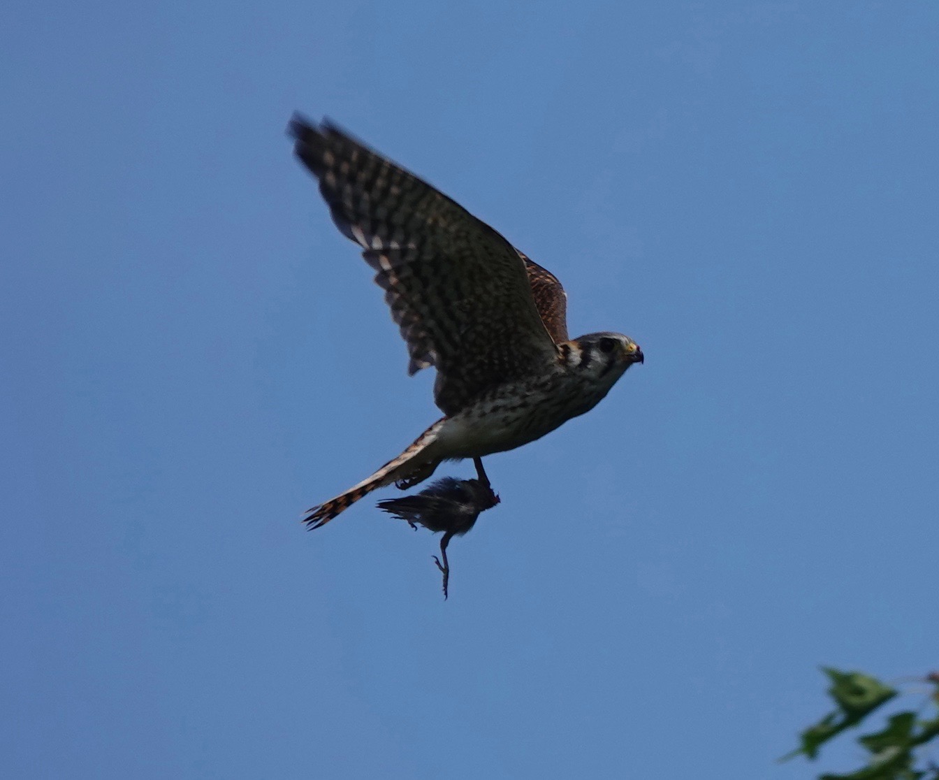 Here she is again, flying in some prey. She took it to the male fledgling tree and then flew off, I believe to encourage the young’uns to follow. They didn’t while I was there.