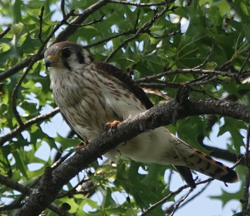 Within the cemetery, I soon found this female fledgling. This is the same oak I found the fledglings in last year, on June 7, 2024. It is one of the nearest big trees to the nest.