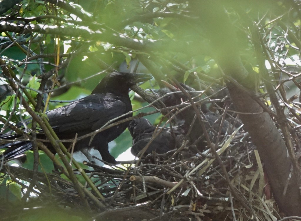 Through fence and scrub, across the tracks of the D train cut, a glimpse of nestling crows. This is one of three local crows nest I’ve spotted this season, but the only one I can see now that the trees are crowded with leaves.