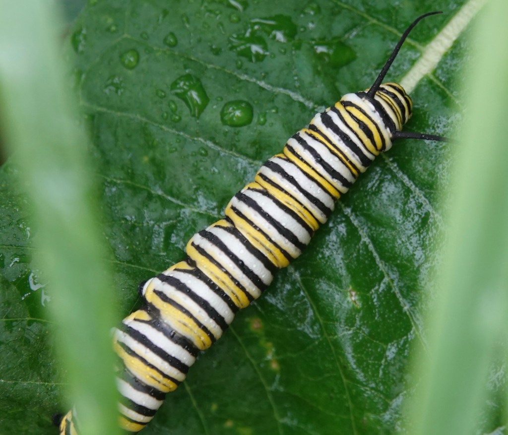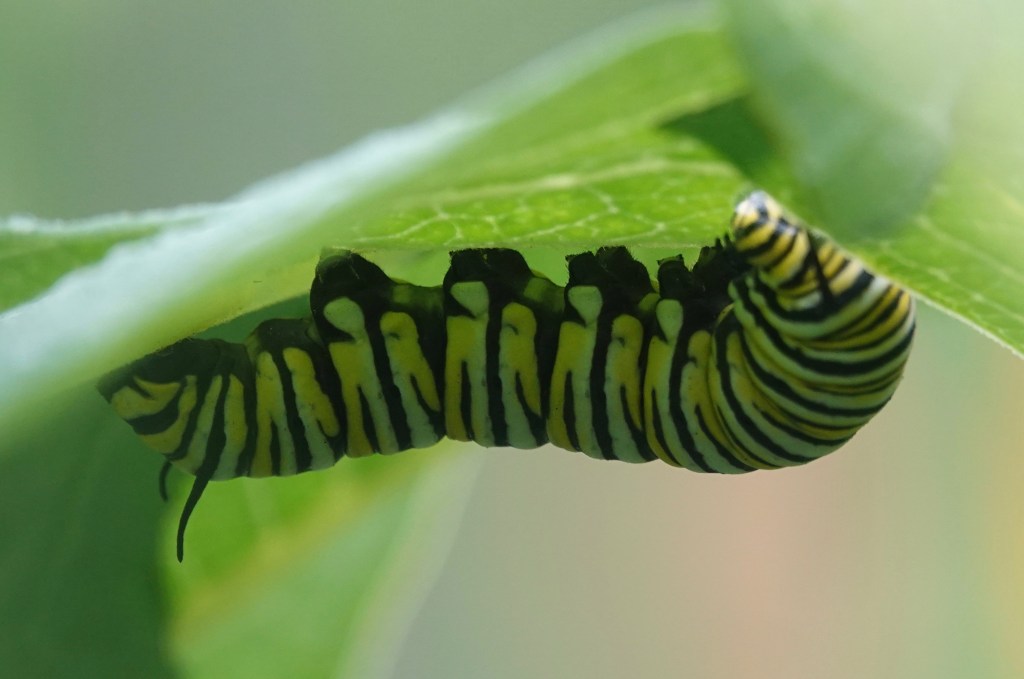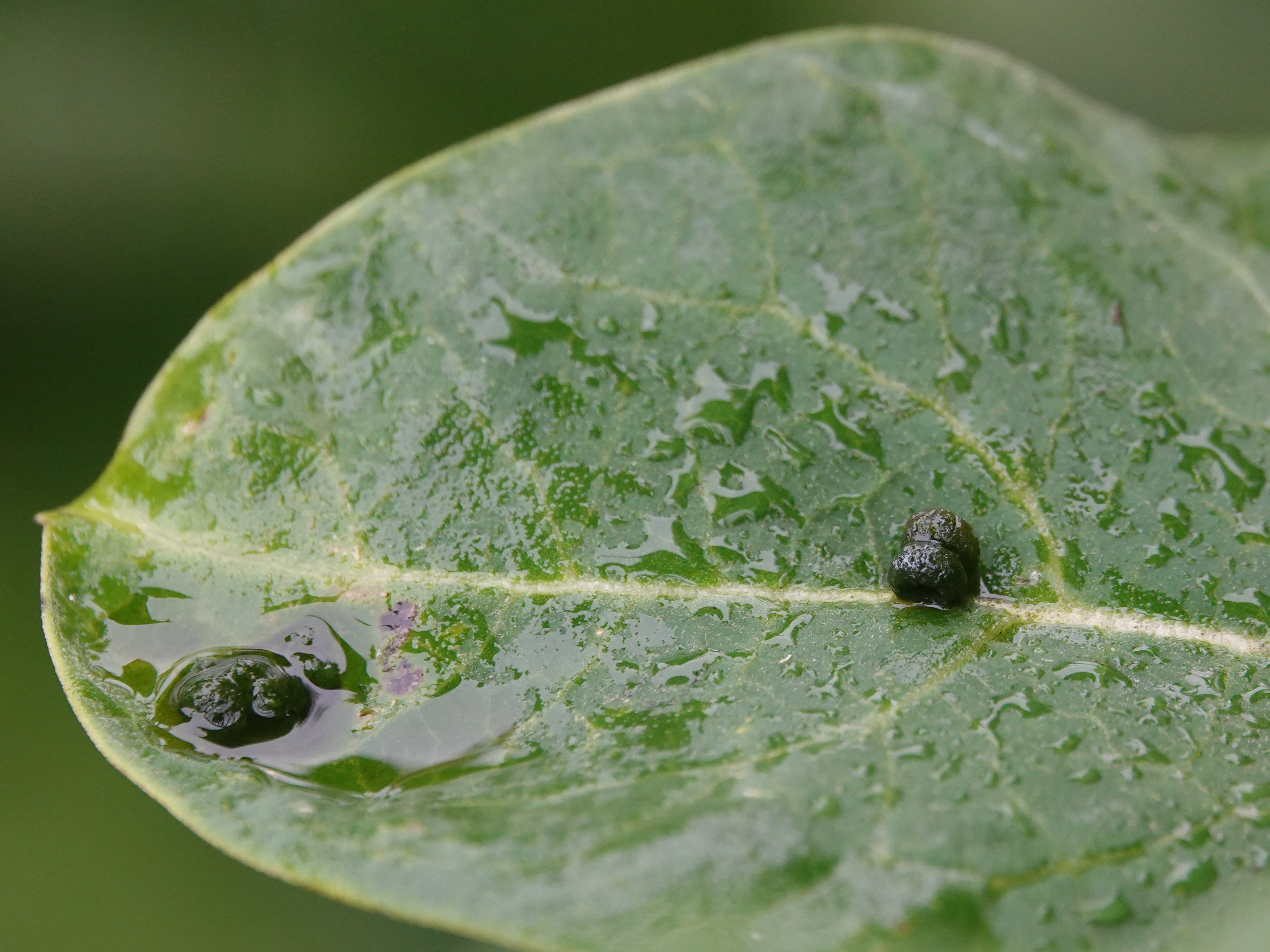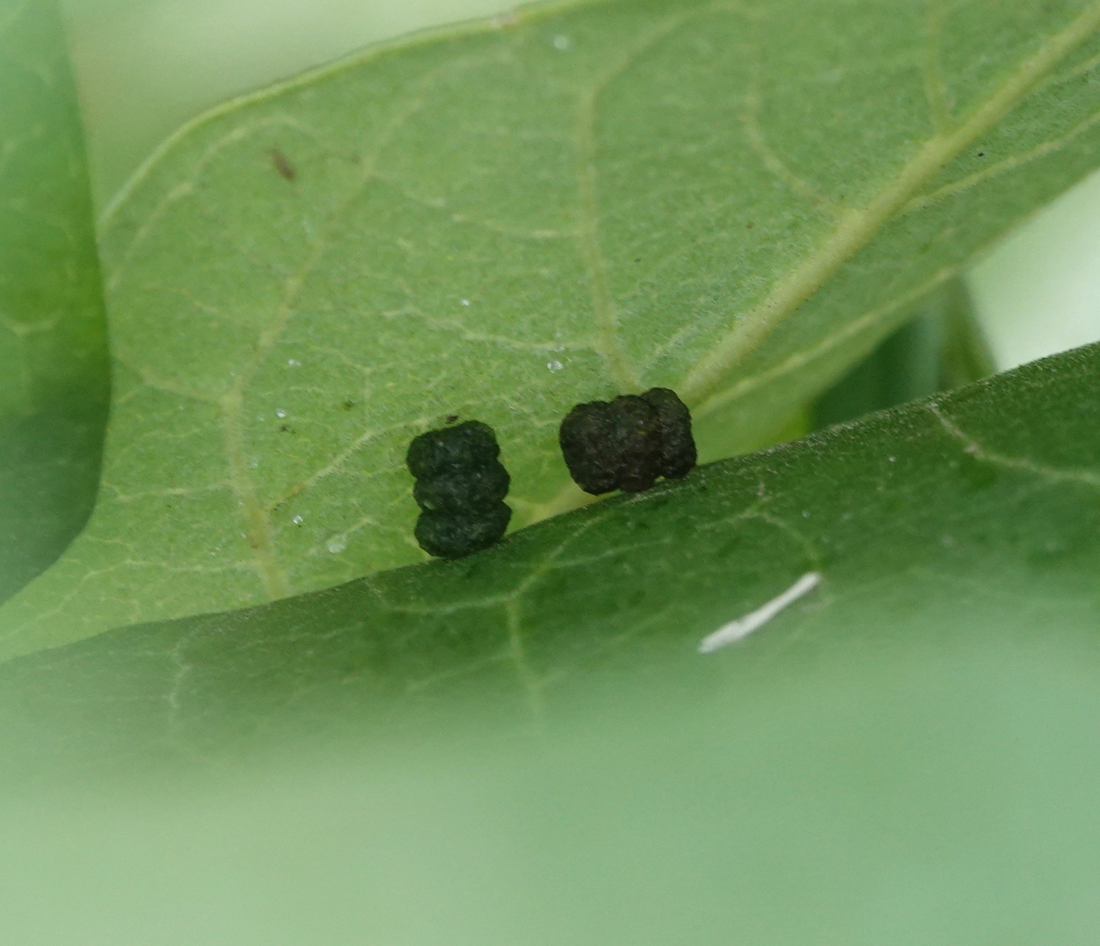 Big poops on a Common Milkweed leaf underneath a seriously chewed-back leaf? That’s a sign!