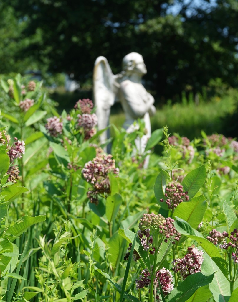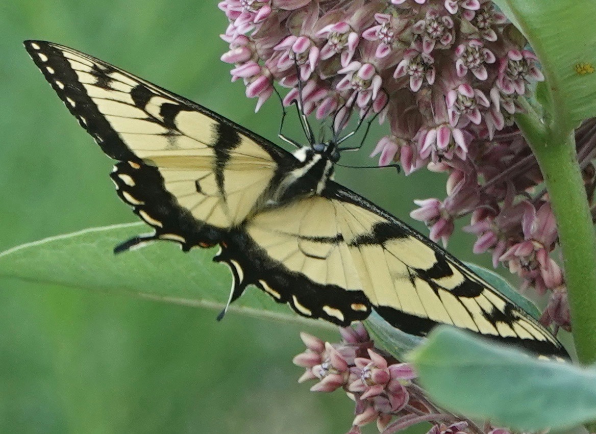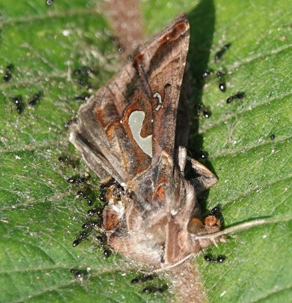An investigation revealed this to be a Bilobed Looper Moth/Megalographa biloba, dead of unknown causes, being recycled by ants. Just sitting out on a Common Milkweed leaf.