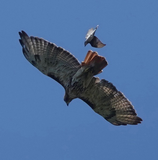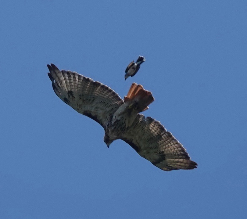Eastern Kingbird riding Red-tailed Hawk out of Sylvan Water airspace.