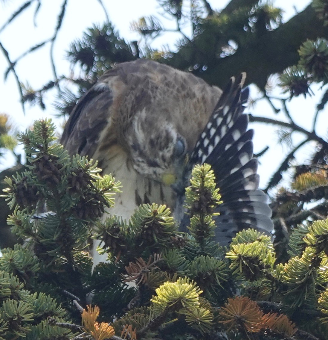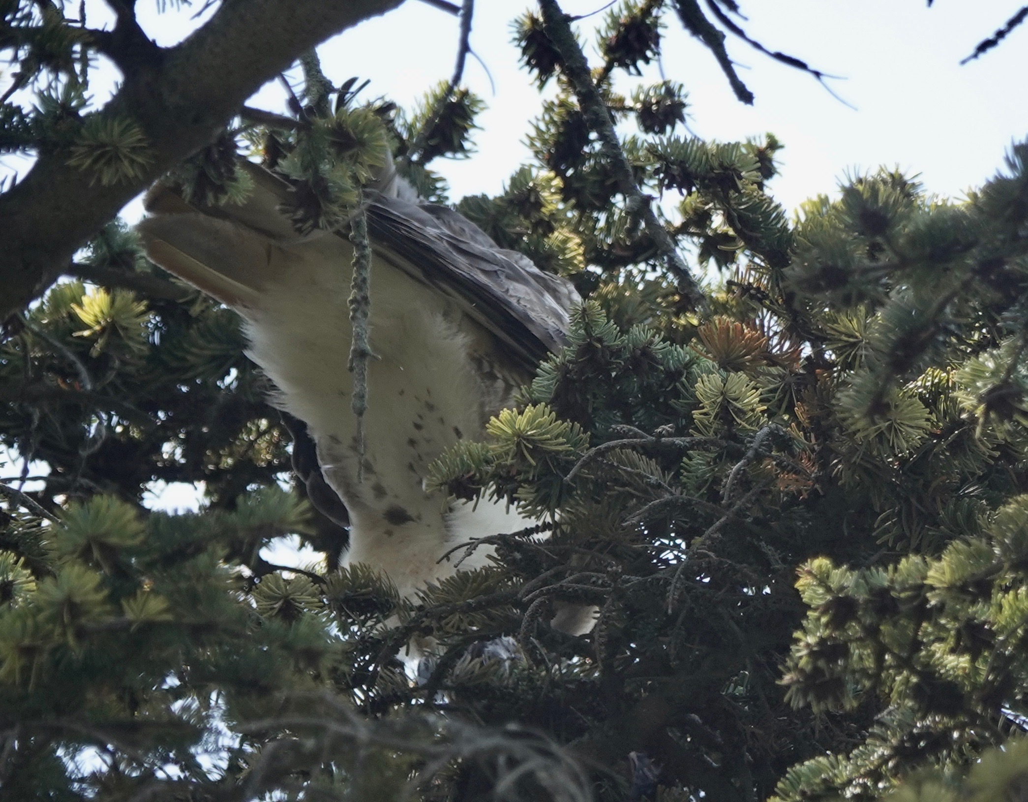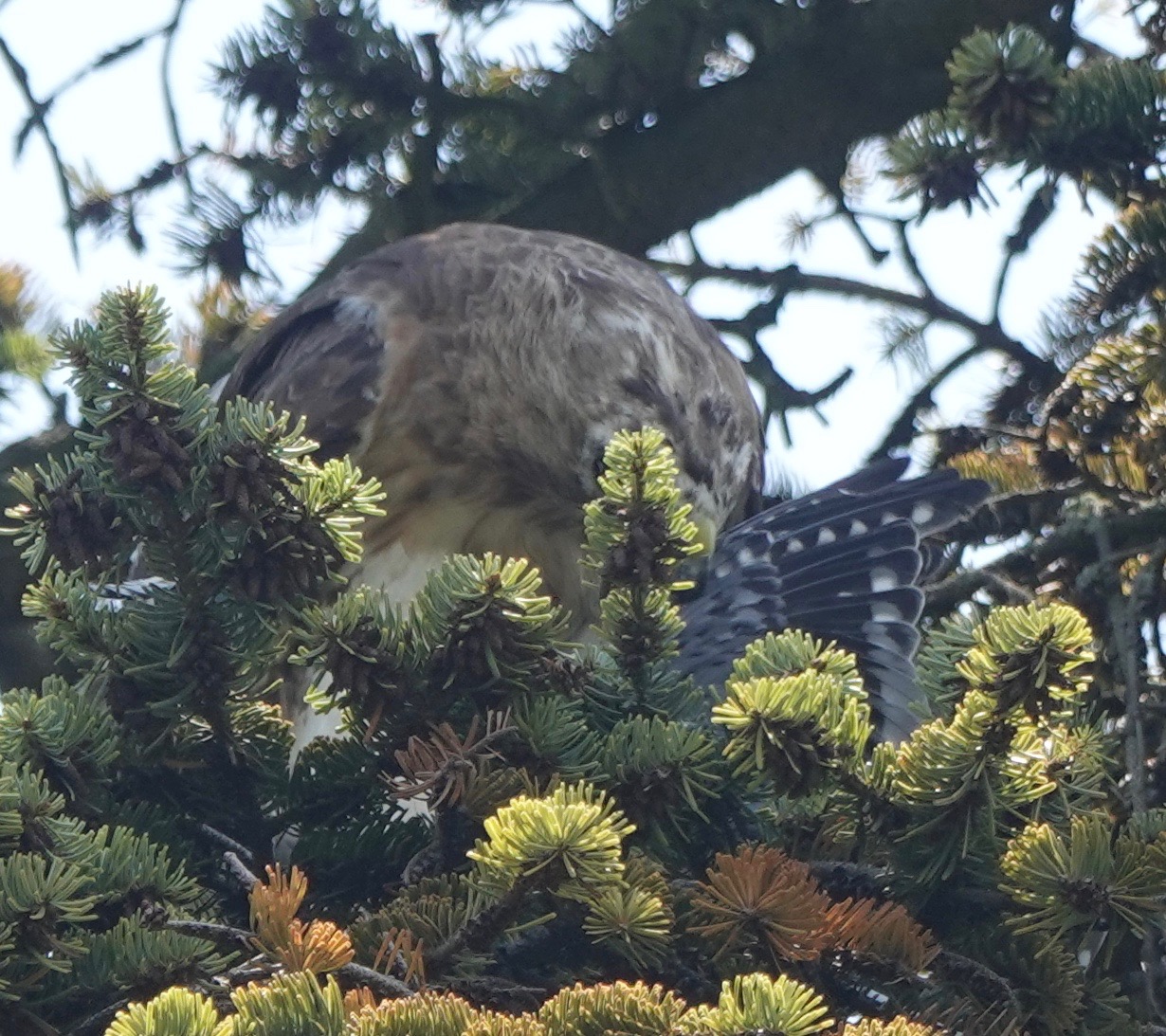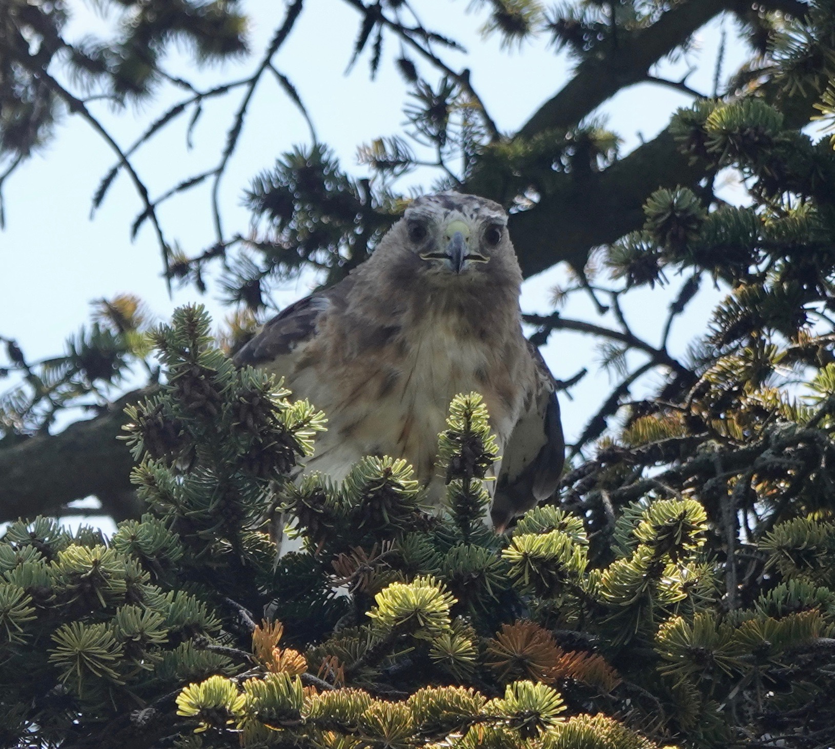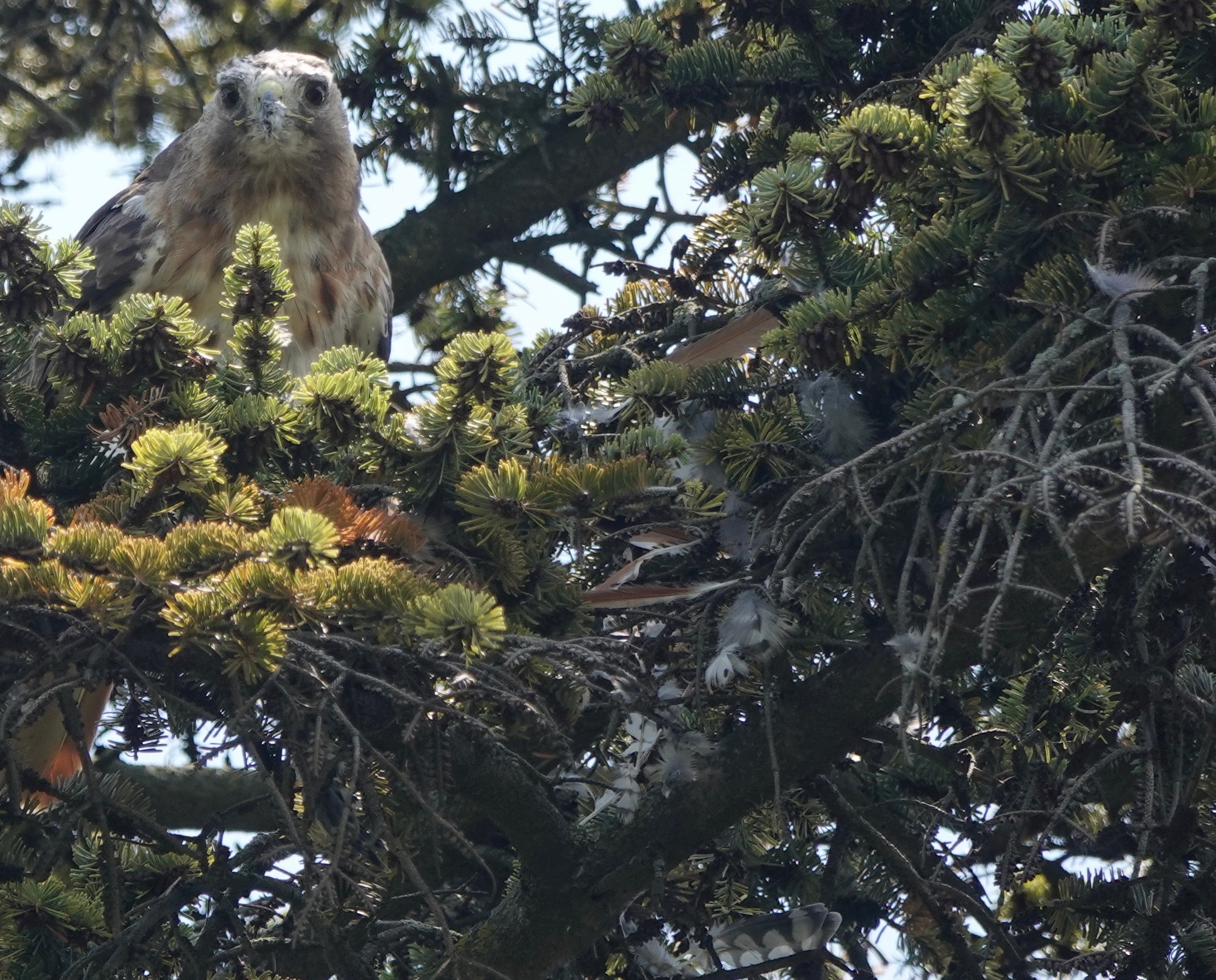 A Red-tailed Hawk flew into this tree with prey in talons.