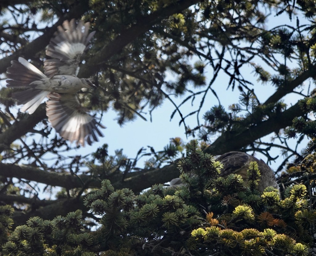 The local Northern Mockingbirds went bananas. Three of them yelled and dove at the big hawk over and over.