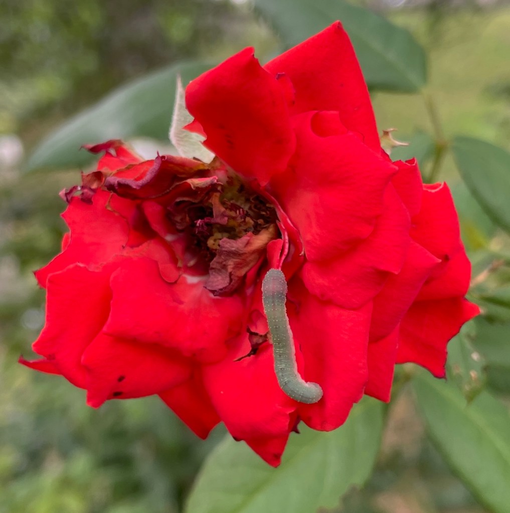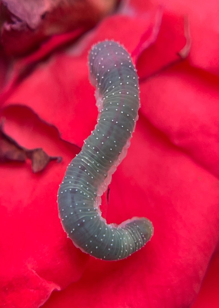 There were three of these on this cultivated rose. This one was curled under a bloom. (Life on a store-bought rose!)