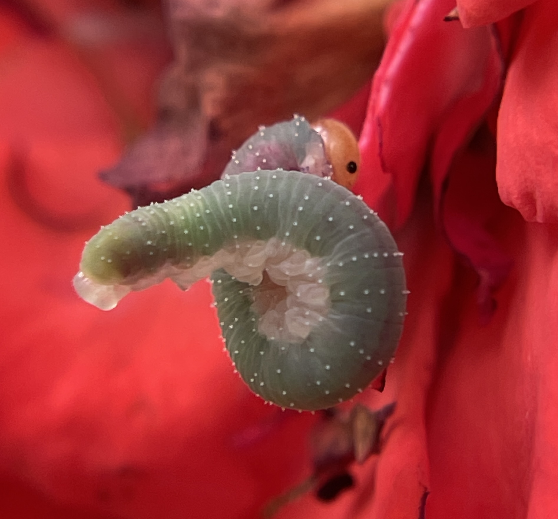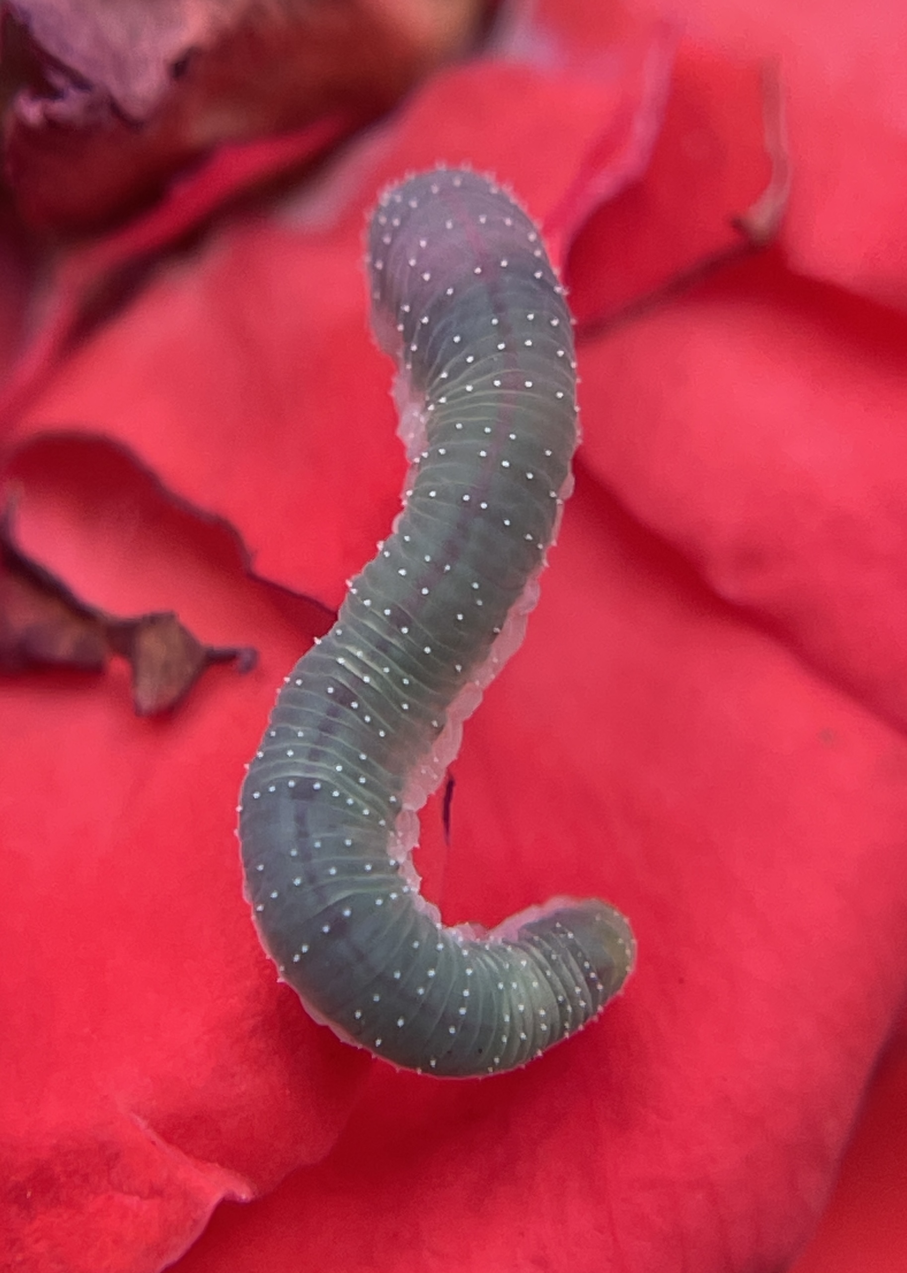 There were three of these on this cultivated rose. This one was curled under a bloom. (Life on a store-bought rose!)